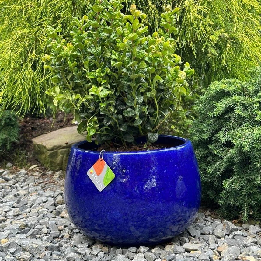 Donica ogrodowa ceramiczna ze szkliwioną glazurą, w kolorze głębokiego kobaltu to połączenie elegancji, trwałości i unikalnego rzemiosła. Jej forma przypomina klasyczną misę o delikatnie zwężanym ku górze kształcie, który harmonijnie współgra zarówno z bujną roślinnością, trawami, kwiatami, jak i minimalistyczną architekturą. Lśniące szkliwo nadaje powierzchni wyjątkowego połysku, a intensywny kolor przyciąga wzrok, wnosząc do przestrzeni wyrazisty akcent.