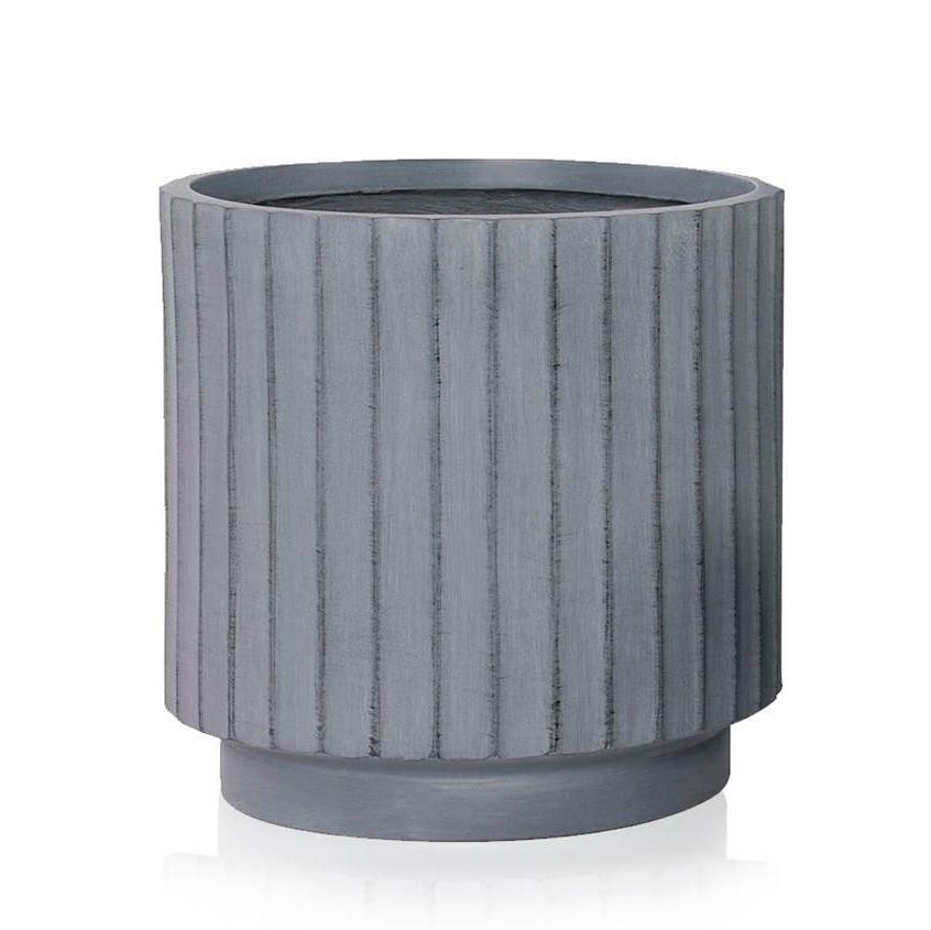 Ta wersja wyróżnia się pionowym, subtelnie żłobionym wykończeniem. Regularne ryflowania nadają bryle rytm i głębię, dzięki czemu donica nie jest jedynie tłem dla rośliny, ale świadomym elementem aranżacji. Matowa powierzchnia w odcieniu szarości podkreśla minimalistyczny charakter i dobrze komponuje się z drewnem, szkłem oraz stalą.