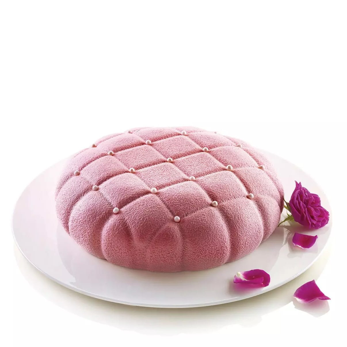 Model Eleganza Ø22 cm wys. 6 cm wyróżnia się pikowaną, trójwymiarową powierzchnią inspirowaną elegancką biżuterią. Geometryczne tłoczenie pięknie odbija światło na polewie lustrzanej, ganache, kremie maślanym czy aksamitnym velvet spray.
