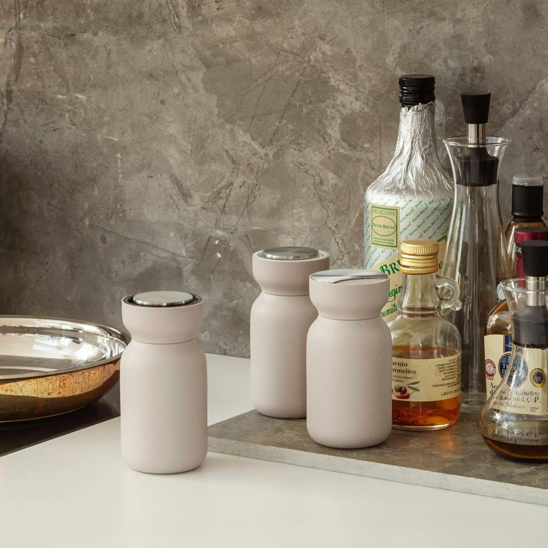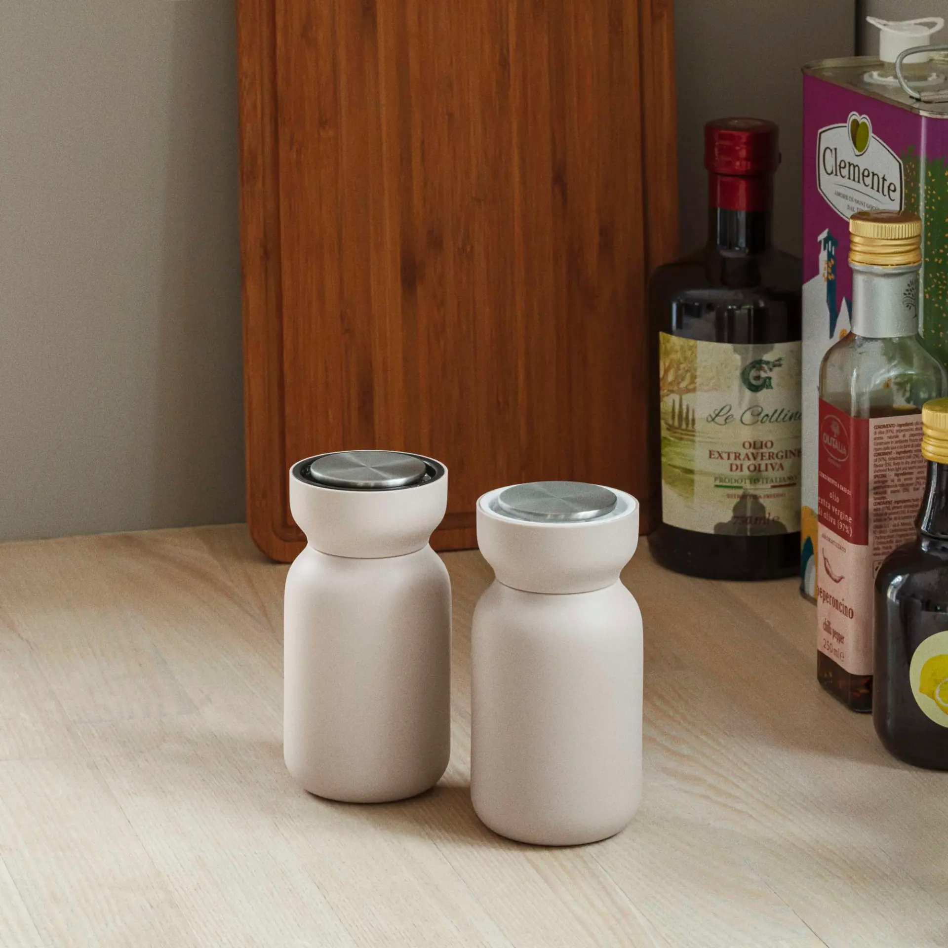 Kolor Sand i miękka linia formy sprawiają, że model naturalnie komponuje się z młynkami do soli i pieprzu z tej samej kolekcji. Nie jest dodatkiem przypadkowym. To element, który porządkuje przestrzeń i buduje spójność aranżacji. Dozownik do przypraw do nowoczesnej kuchni może być zarówno praktycznym narzędziem, jak i detalem estetycznym.