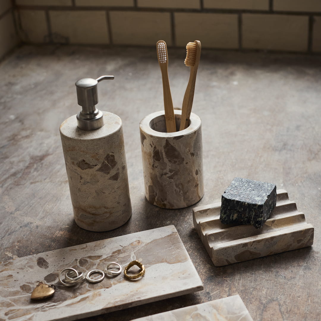 Wykonany z autentycznego marmuru, ten elegancki dozownik jest nie tylko praktycznym akcesorium, ale też dekoracyjnym detalem, który wnosi do wnętrza spokój, harmonię i ponadczasowy styl.