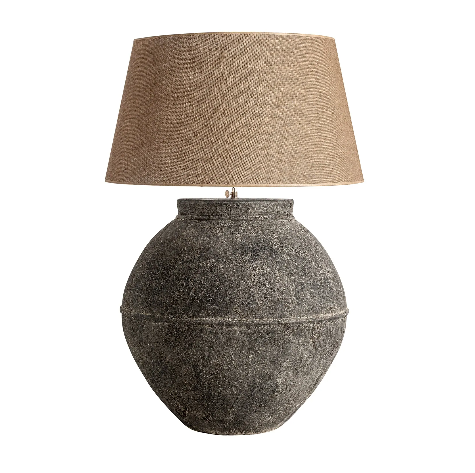 Ekskluzywna duża lampa stołowa z podstawą z terakoty i jutowym kloszem stylu Contemporary to doskonałe połączenie naturalnych materiałów, eleganckiej prostoty i surowego piękna. Wykonana z szarej terakoty z efektem postarzania, nadaje wnętrzu subtelny, artystyczny charakter, który nawiązuje do dawnych technik rzemieślniczych, jednocześnie wpisując się w nowoczesne trendy wnętrzarskie. Jej duży, jutowy klosz w odcieniu jasnego brązu pięknie rozprasza światło, tworząc przytulną i ciepłą atmosferę.