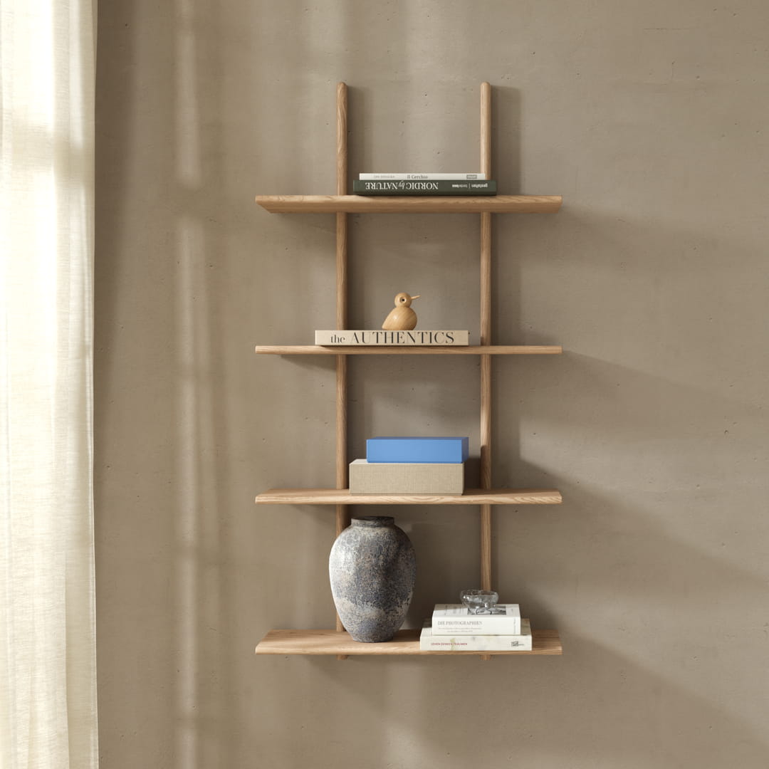 Wąska, elegancka forma i naturalny odcień dębu sprawiają, że półka doskonale odnajduje się w nowoczesnych, skandynawskich i japandi wnętrzach. Jej obecność dodaje przestrzeni harmonii i naturalnej równowagi. Stałe rozmieszczenie półek gwarantuje stabilność i wizualną spójność, dzięki czemu całość wygląda minimalistycznie, ale luksusowo.