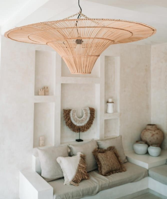 Klosz rattanowy idealnie sprawdzi się do wnętrz w stylu contemporary, boho, skandynawskim, japandi, nadmorskim. Jest stylowy i designerski. Uzupełni wystrój mieszkania dodając pomieszczeniu ciepła, przytulności, naturalności. Przeznaczony do zawieszenia w jadalni, w kuchni nad stołem, do salonu, jak i w sypialni. Zastosowany zamiast klasycznej, tradycyjnej lampy sufitowej stanie się jednym z ciekawszych elementów aranżacyjnych pomieszczenia. Wspaniale komponuje się z bielą, beżami, brązem, czy szarościami.