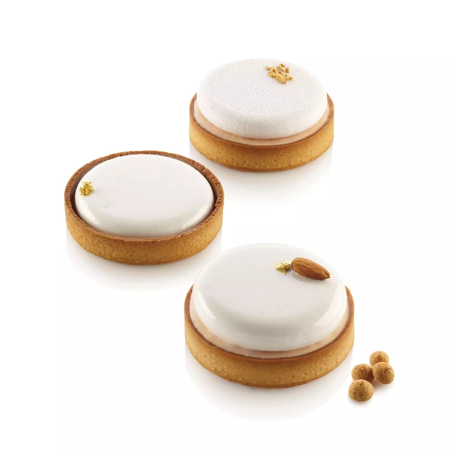Zestaw składa się z 4 ringów cukierniczych o średnicy 10 cm, które służą do wypieku kruchego spodu, oraz platynowej formy silikonowej Ø8,5 cm, umożliwiającej przygotowanie warstwy musu, kremu lub galaretki dopasowanej do wielkości tarty. Dzięki temu można przygotować nowoczesne mini tarty z musem lub kremem, które zachowują idealną geometrię i powtarzalność porcji.