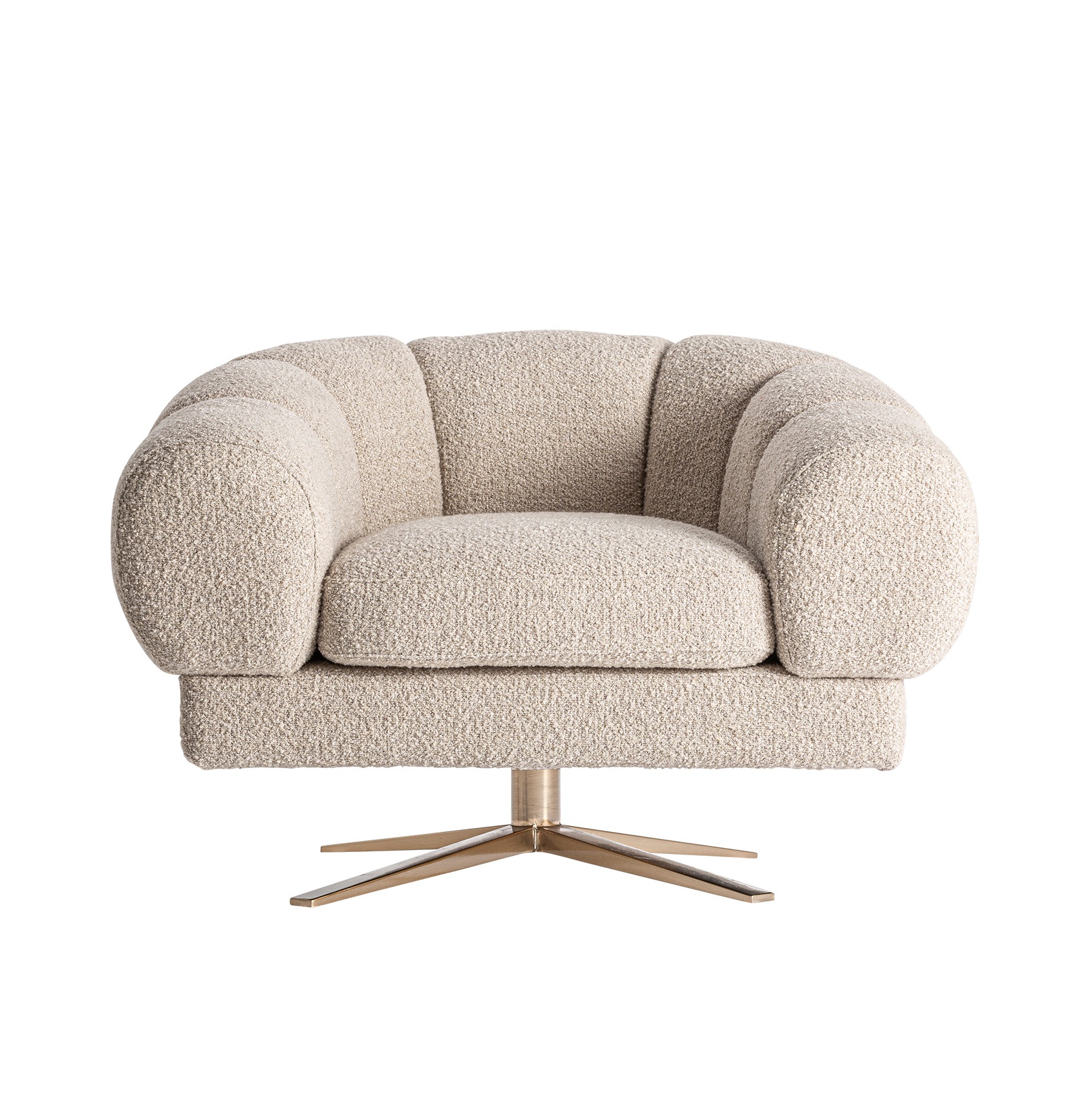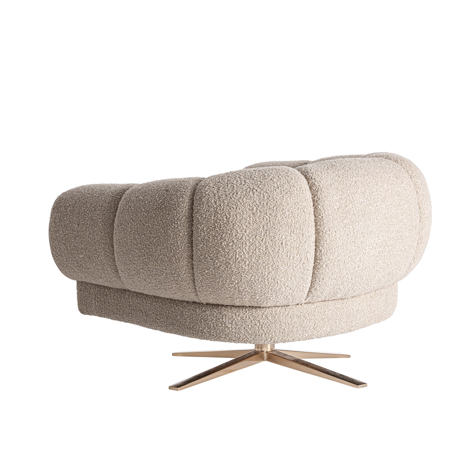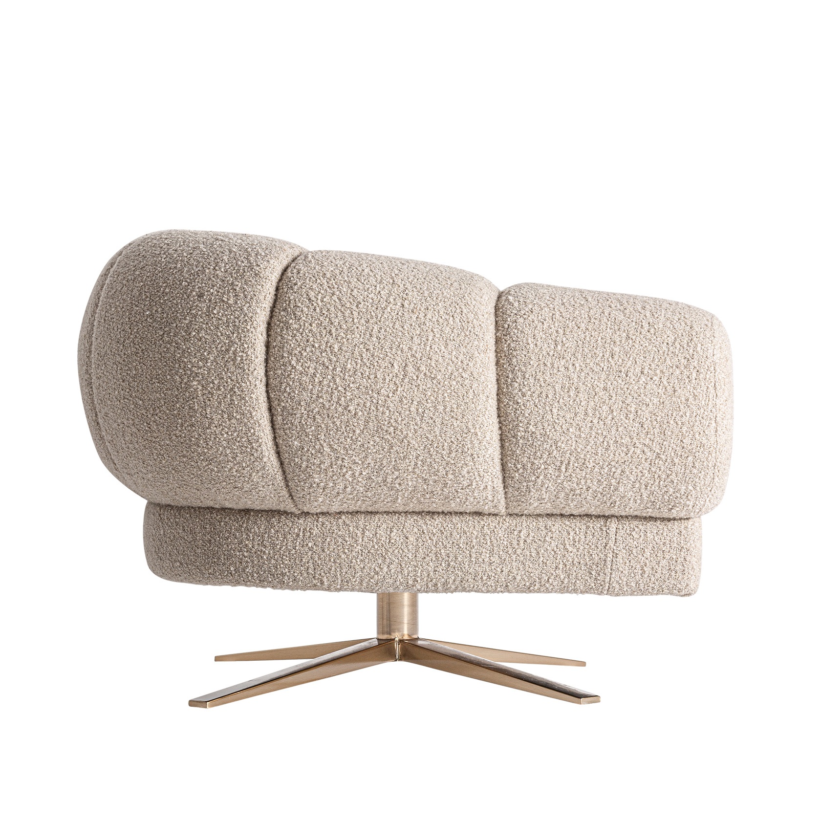 Bryła inspirowana formą muszli otula plecy i ramiona, tworząc naturalne poczucie komfortu. Tapicerka z poliestru boucle w odcieniu kremowej złamanej bieli z marmurkowym wykończeniem nadaje głębi i elegancji, bez efektu płaskiej, jednolitej tkaniny.