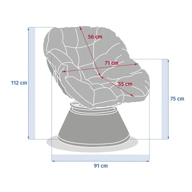 - Wymiary: 91 cm, wysokość max 112 cm, Wysokość oparcia: 56 cm, Głębokość siedziska: 55 cm, Szerokość siedziska: 71 cm, Wysokość siedziska: 41 cm