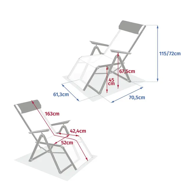- Wymiary: długość 163 cm, szerokość całkowita 61 cm, szerokość siedziska bez ramy 52 cm, wysokość 115/72 cm