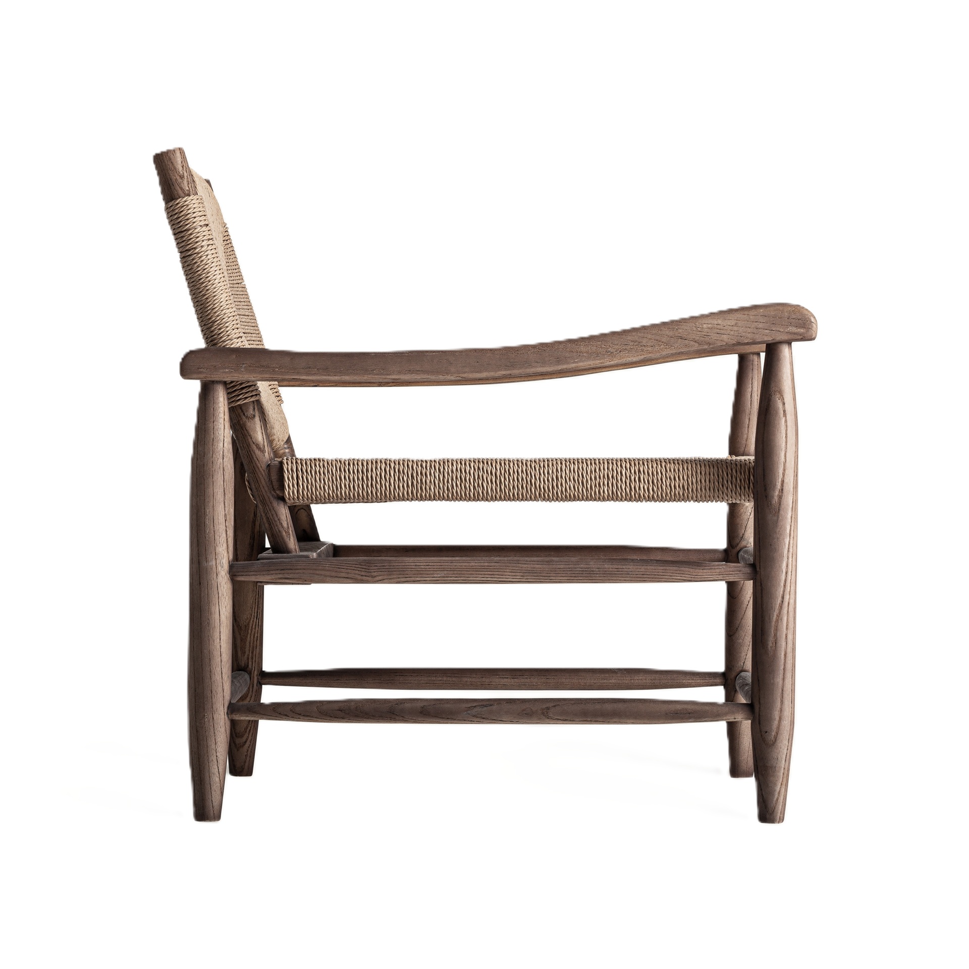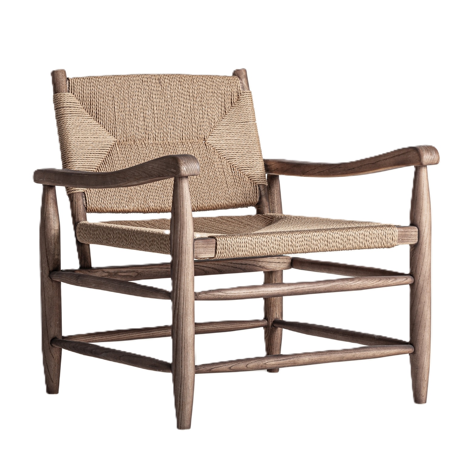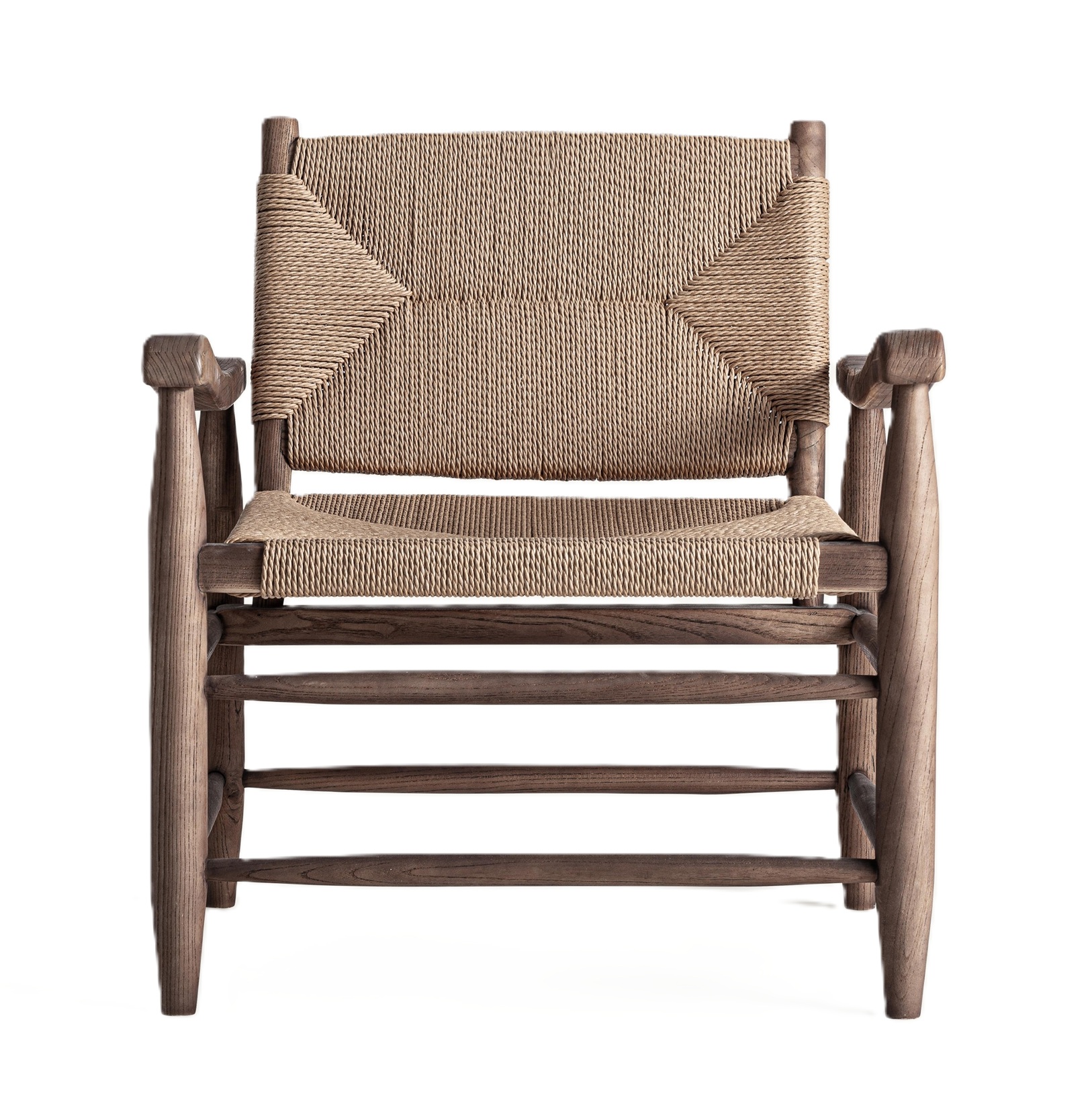 To fotel do salonu z drewnianą ramą i plecionym siedziskiem, który harmonizuje z drewnem, kamieniem i naturalnymi tkaninami.