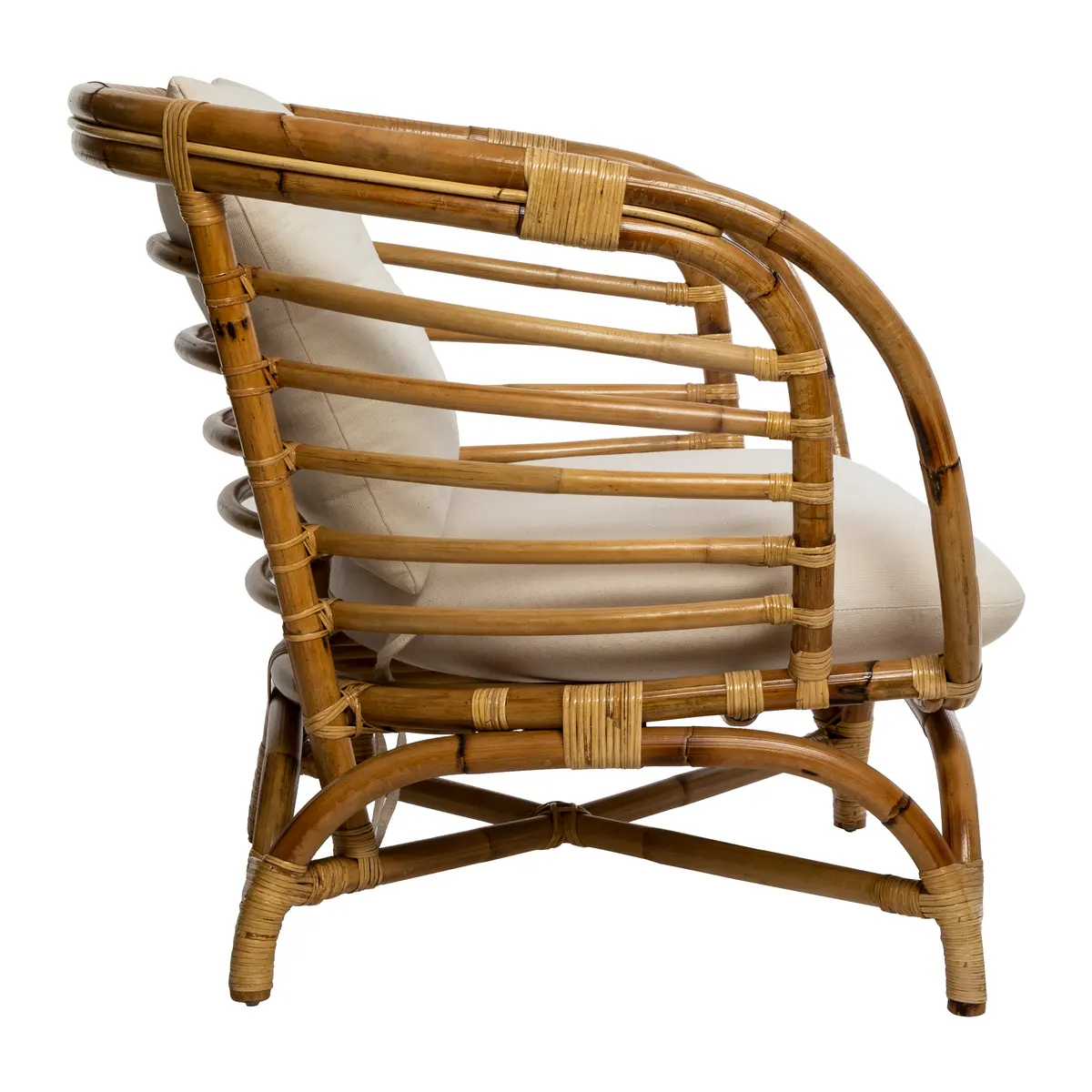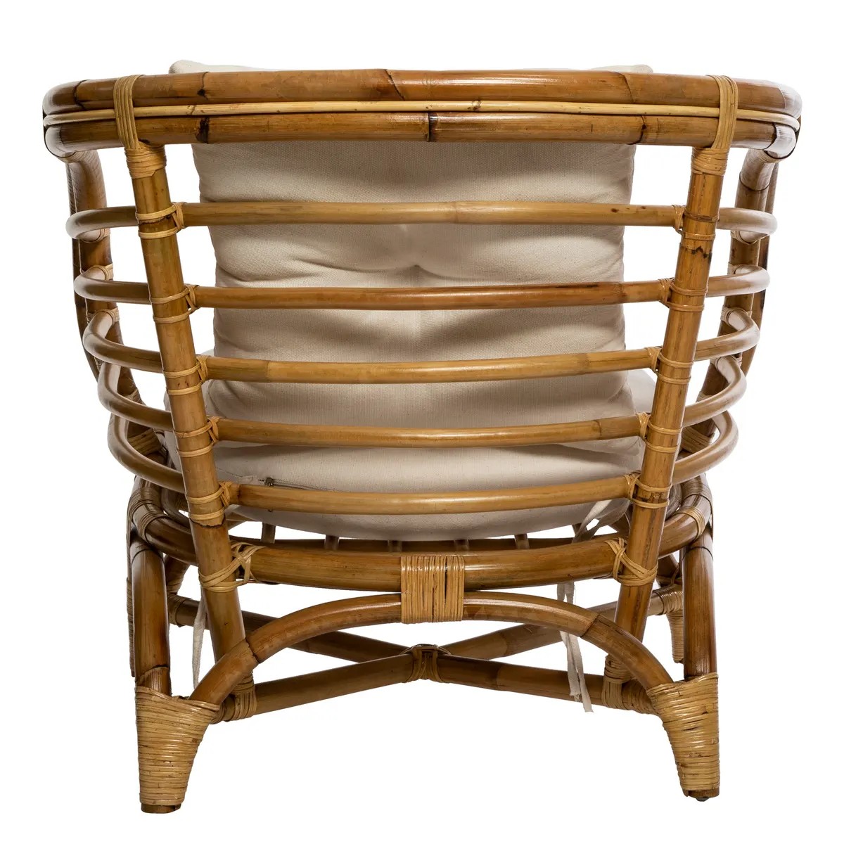 Fotel rattanowy Farah od Atmosphera to połączenie naturalnej elegancji i wygody, idealne dla osób szukających przytulnych i stylowych akcentów do wnętrza. Wykonany z wytrzymałego rattanu, fotel ten wyróżnia się zakrzywionymi liniami, które nadają mu organiczny, relaksujący wygląd.