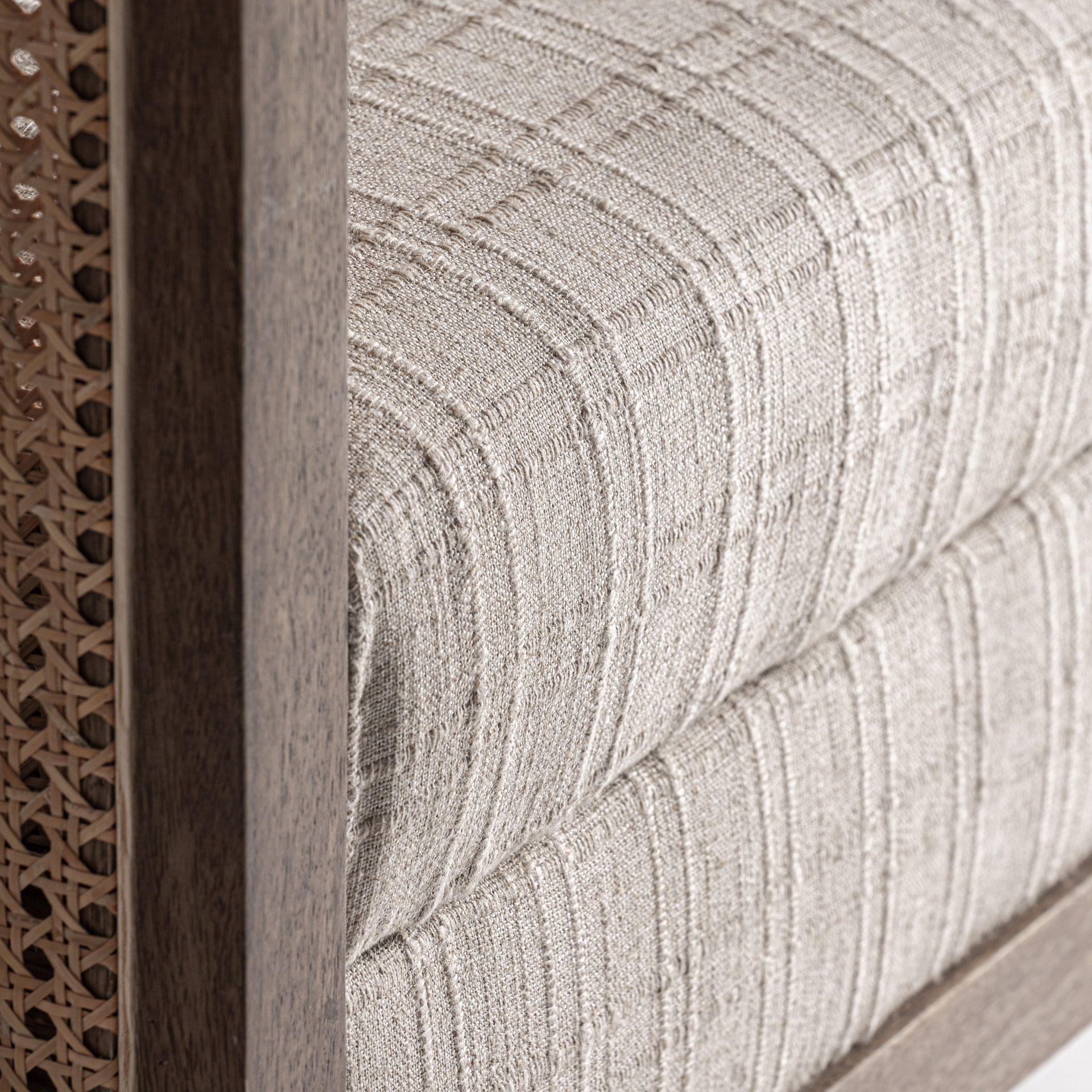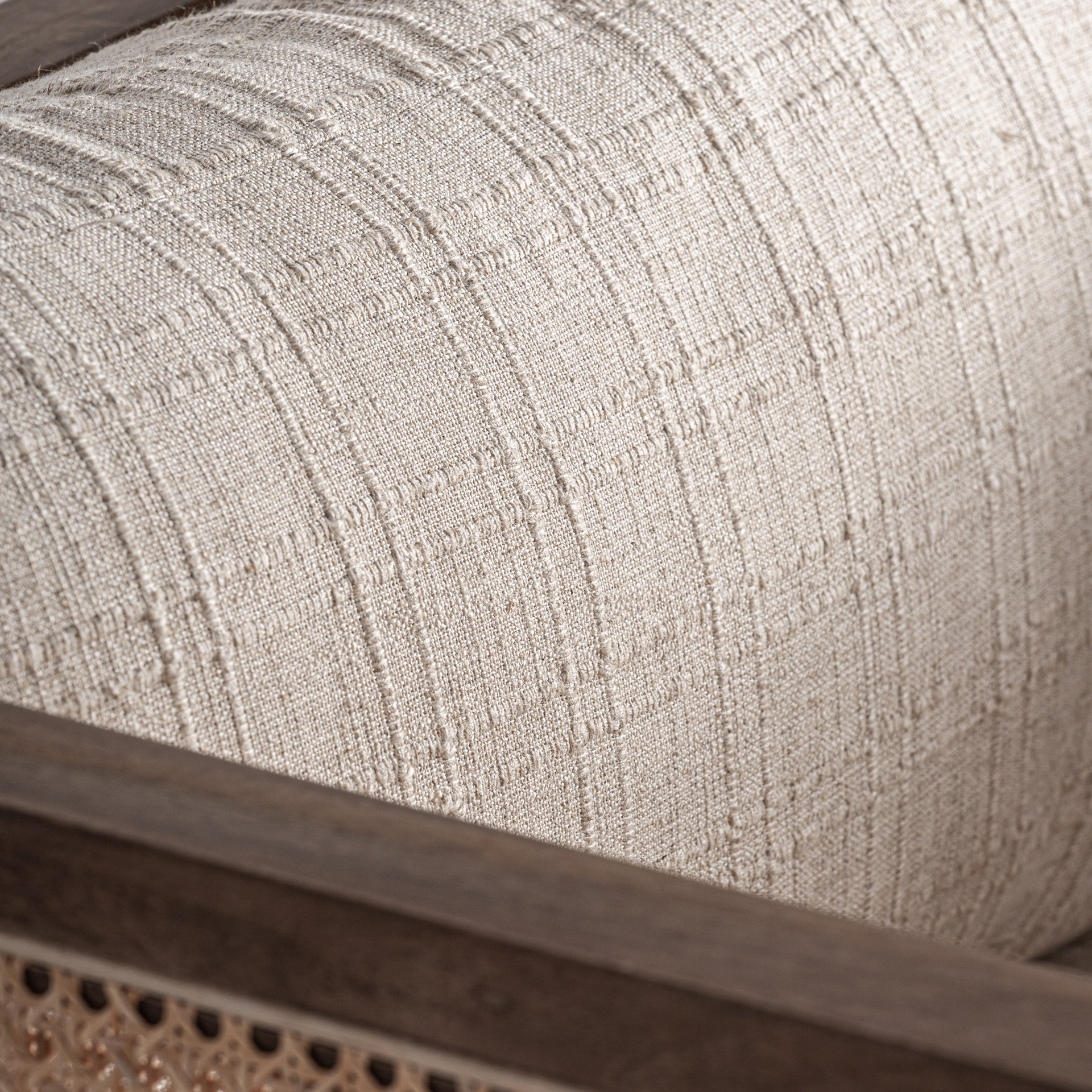 Tapicerowane siedzisko i oparcie w kolorze taupe tworzą stonowany kontrast wobec drewna. Całość jest geometryczna, uporządkowana, proporcjonalna. To fotel drewniany z plecionką i tapicerką premium, który łączy stabilność konstrukcji z wizualną lekkością.