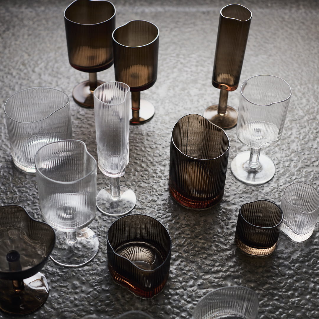 Każdy kieliszek Ripe jest dmuchany ustami, co oznacza drobne różnice w grubości szkła, rytmie ryflowania i linii krawędzi. Mogą pojawić się subtelne pęcherzyki powietrza, będące naturalnym efektem rzemiosła. Te detale nie są wadą — sprawiają, że kieliszki nie wyglądają jak seryjny produkt, lecz jak przedmioty z charakterem, które dobrze starzeją się w użytkowaniu.