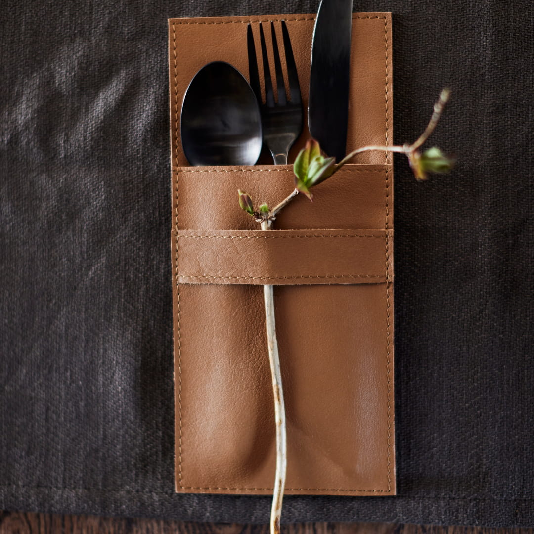 Zamień codzienny posiłek w ekskluzywną ucztę dzięki kieszeni na sztućce ze skóry bawolej Camou Muubs, w odcieniu camel – elegancki detal, który natychmiast odmieni stół.