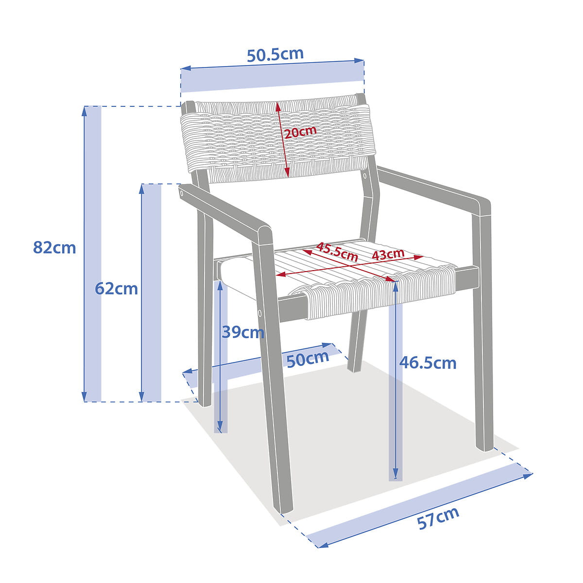 - Wymiary: Dł. 61 x szer. 57 x wys. 82 cm. Wysokość podłokietnika 62,50 cm. Wysokość siedziska 46,5 cm