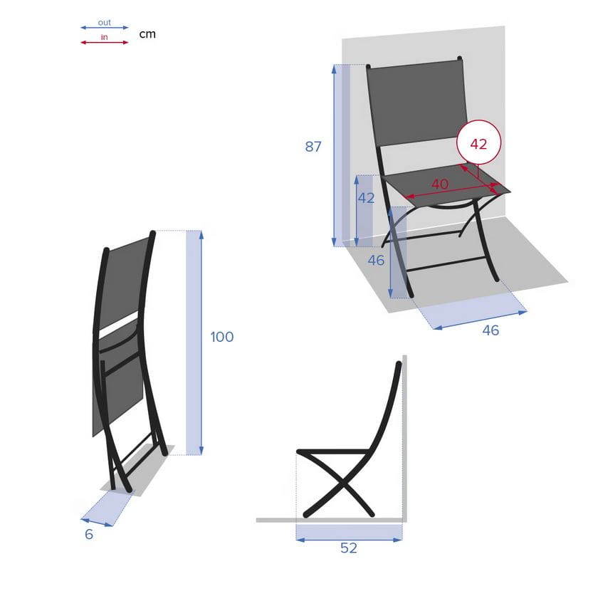 - Wymiary: szerokość 46 cm, głębokość całkowita 52 cm, wysokość całkowita 87 cm. Wysokość siedziska: 46 cm, Szerokość siedziska: 40 cm, Głębokość siedziska: 42 cm, Produkt złożony: 46 x 6 x 100 cm