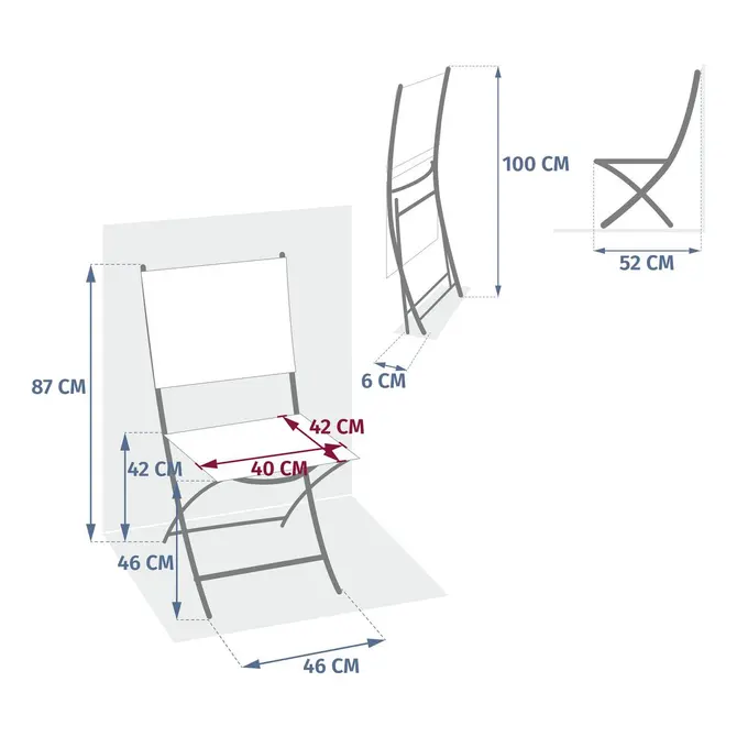 - Wymiary: szerokość 46 cm, głębokość całkowita 52 cm, wysokość całkowita 87 cm. Wysokość siedziska: 46 cm, Szerokość siedziska: 40 cm, Głębokość siedziska: 42 cm, Produkt złożony: 46 x 6 x 100 cm
