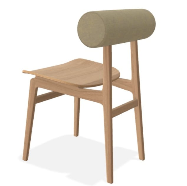 Rama wykonana jest z litego drewna dębowego z certyfikatem FSC, ręcznie wykańczanego i zabezpieczonego bezbarwnym lakierem wodnym. Siedzisko oraz oparcie powstają z laminowanego forniru dębowego, co zapewnia trwałość, stabilność i odporność na codzienne użytkowanie.