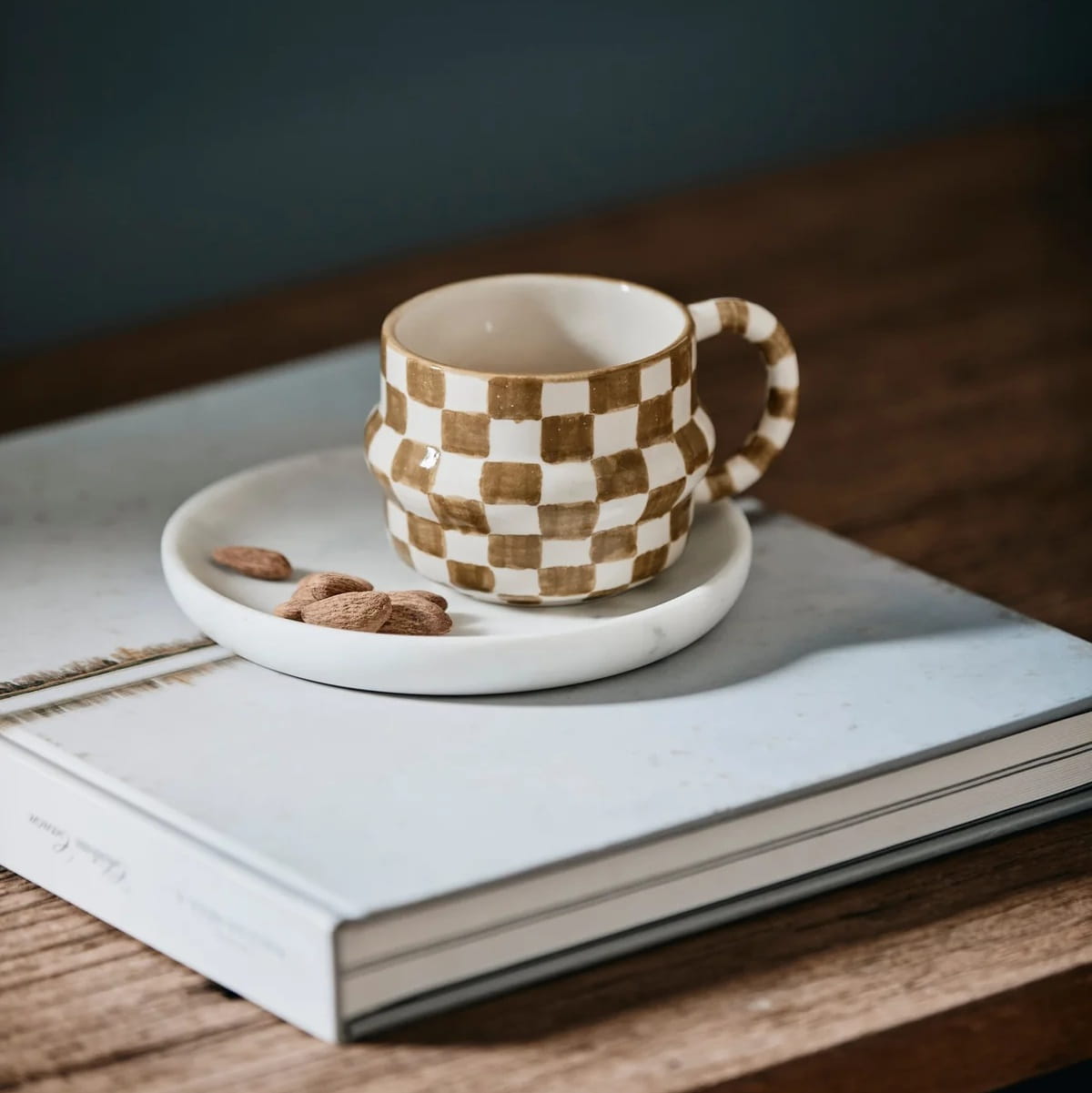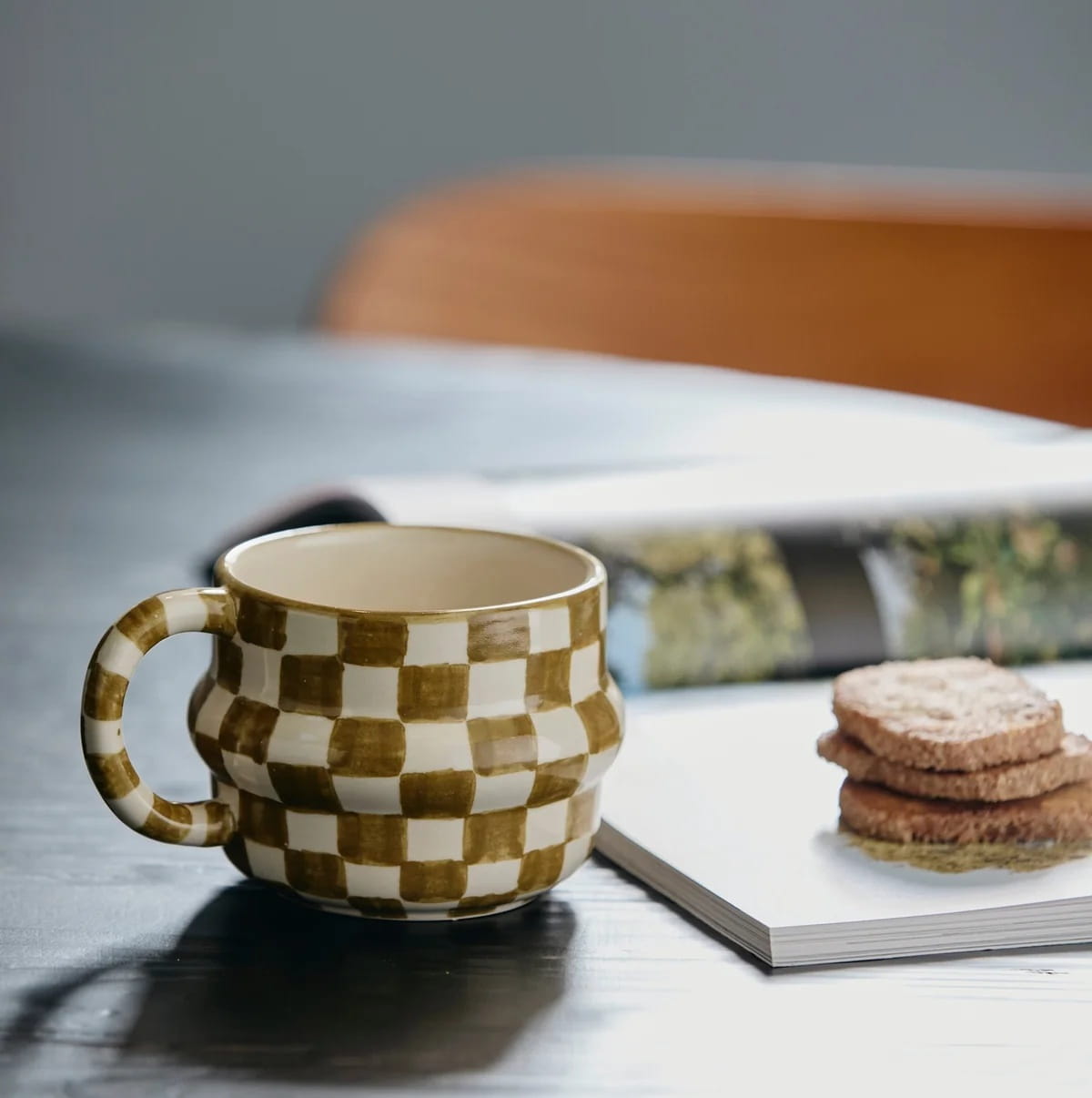 Ręcznie malowany wzór w zielono-oliwkowej-kremowej kratce wprowadza do wnętrza energię i świeżość, nie dominując przestrzeni. Każdy kubek jest inny, co podkreśla autentyczność rzemiosła i sprawia, że zestaw nie wygląda masowo, lecz świadomie zaprojektowanie.