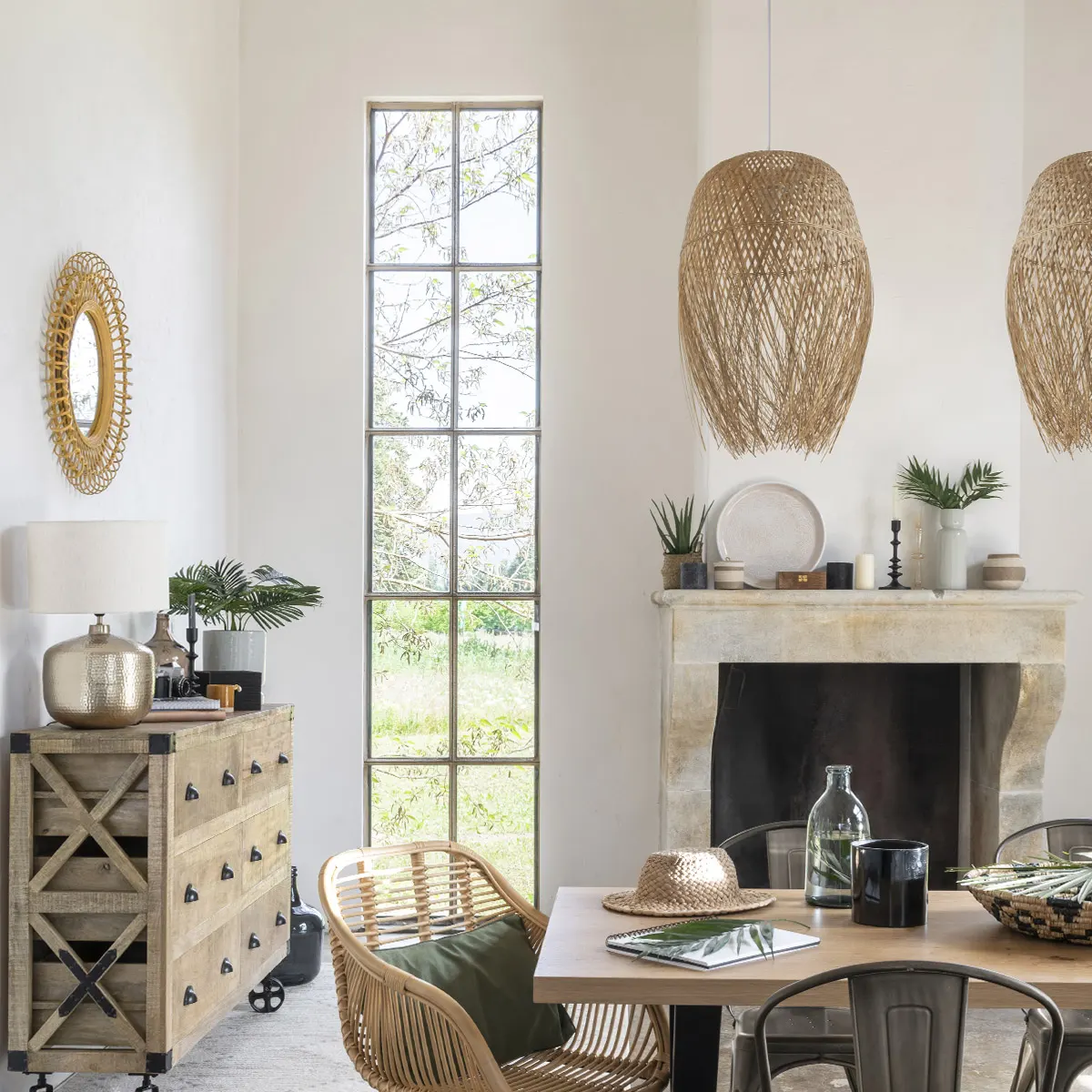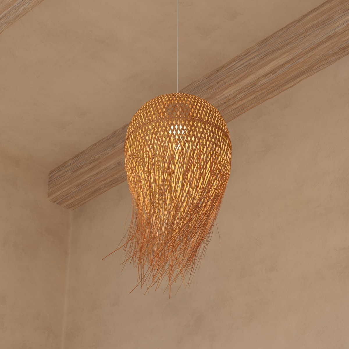 Lampa wisząca bambusowa Elis marki Atmosphera to wyjątkowy element oświetleniowy, który łączy naturalność bambusa z rzemieślniczym wykonaniem, wpisując się w najmodniejsze trendy aranżacyjne. Jej klosz wykonany z delikatnego splotu bambusa zachwyca surową i organiczną estetyką, która z jednej strony emanuje prostotą, a z drugiej wyrafinowanym stylem inspirowanym rękodziełem. Charakterystyczny design, w którym cienkie pasma bambusa luźno splatają się i zdają „rozplatać” ku dołowi, tworzy subtelną grę światła i cienia, dodając wnętrzu niepowtarzalnego uroku.