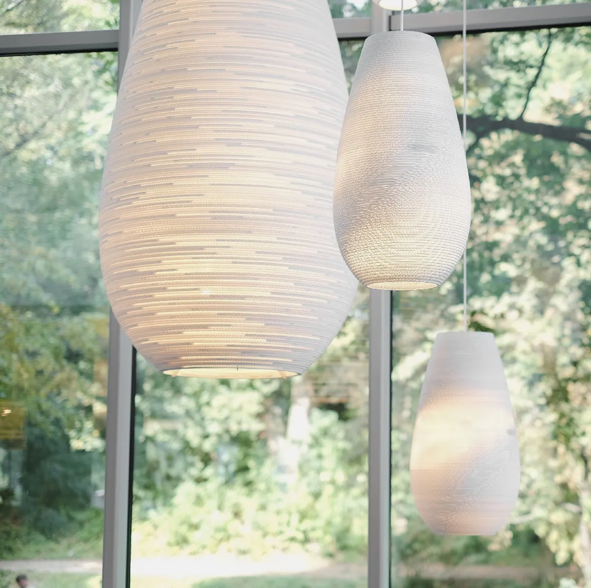 Lampa wisząca Drop z kolekcji Scraplights amerykańskiej marki Graypants to unikalnna lampa designerska wisząca, wykonywana ręcznie z naturalnej tektury falistej pochodzącej z recyklingu.