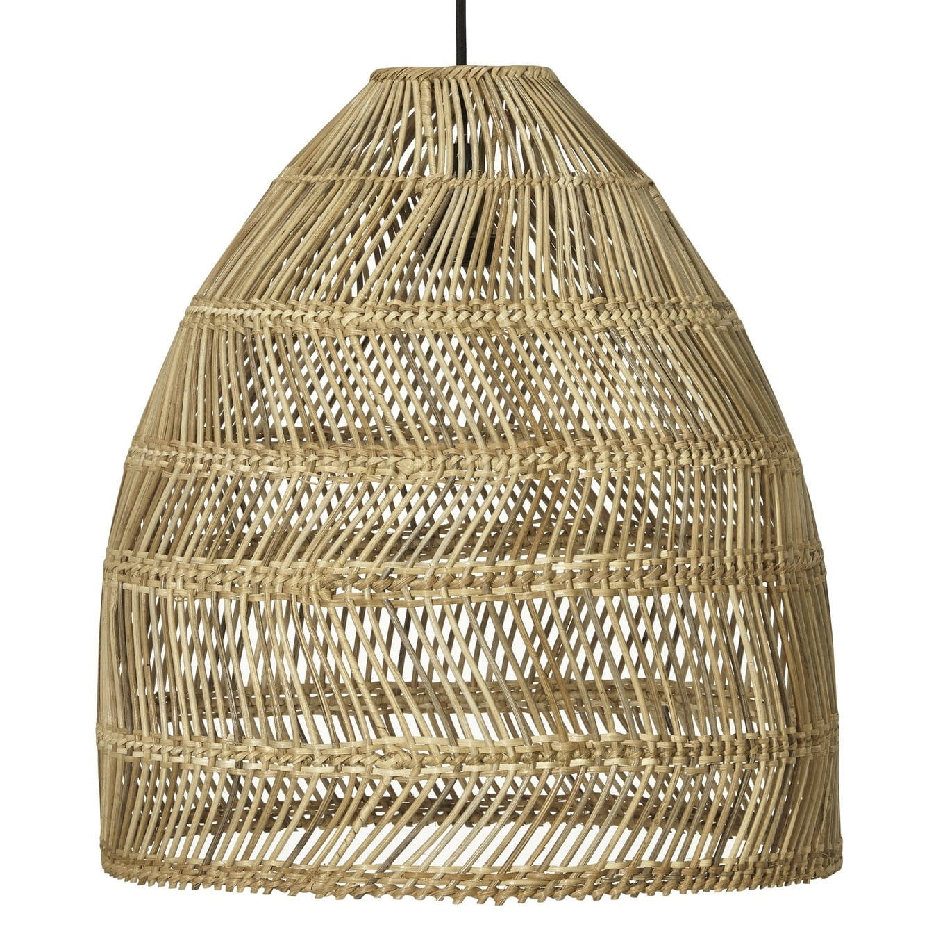 Ręcznie pleciony klosz wykonany z rattanu wyróżnia się pofalowanym wzorem w formie zygzaków, które układają się warstwowo, tworząc unikalny efekt wizualny. Kształt dzwonka nadaje ażurowej lampie rattanowej subtelnej lekkości, idealnie wpasowując ją w różnorodne aranżacje wnętrz.