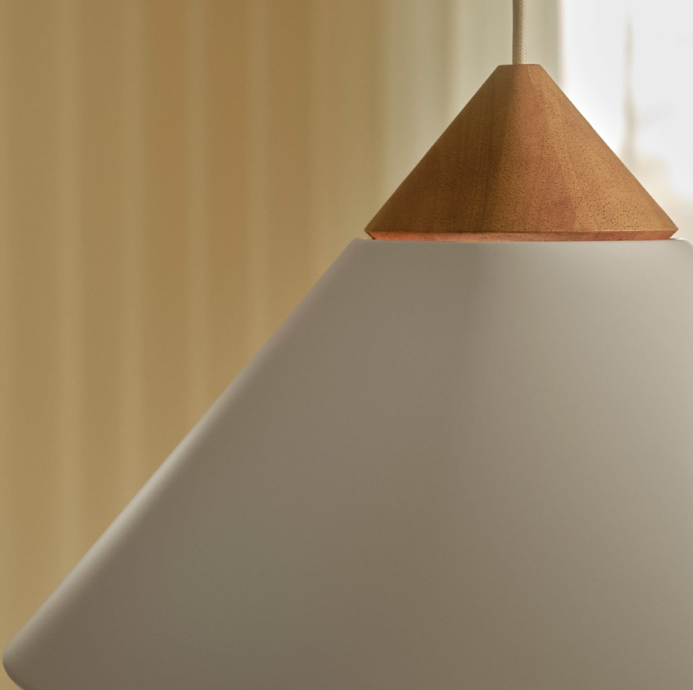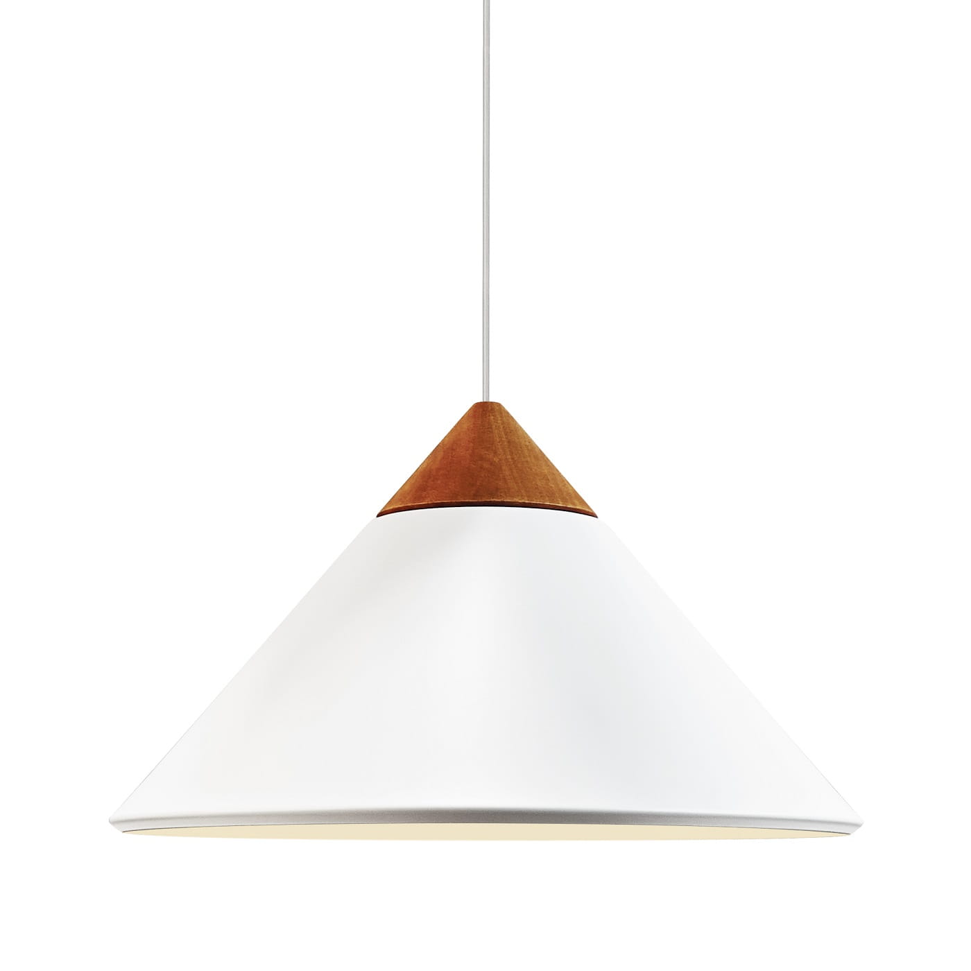 Charakterystyczny stożkowy klosz został wykonany z metalu, a jego górną część zdobi starannie wyprofilowany, ciemny drewniany jesionowy detal wieńczący stożek, uzupełniony subtelnymi akcentami z polerowanego mosiądzu.