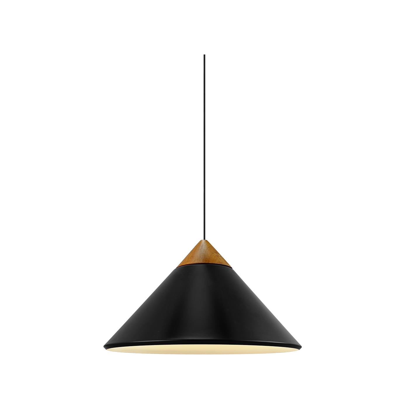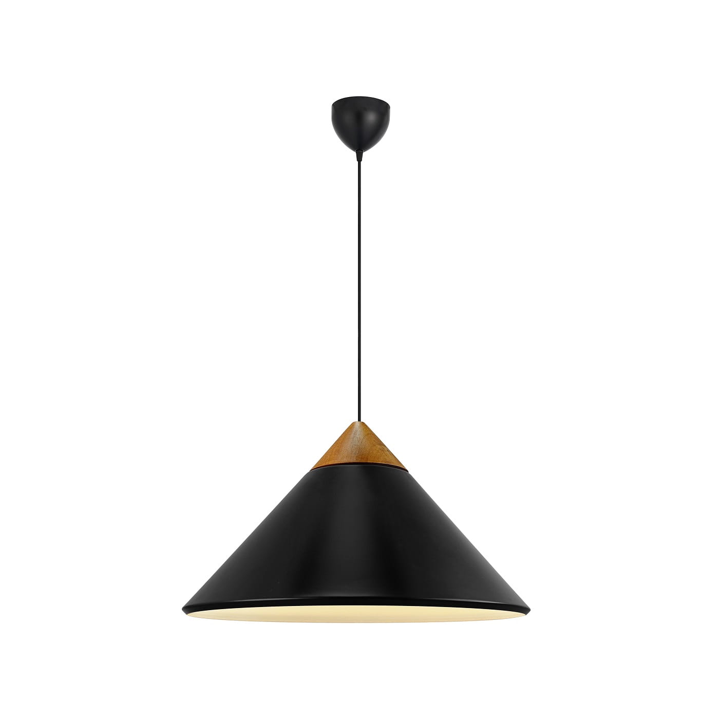 Charakterystyczny stożkowy klosz został wykonany z metalu, a jego górną część zdobi starannie wyprofilowany, ciemny drewniany jesionowy detal wieńczący stożek, uzupełniony subtelnymi akcentami z polerowanego mosiądzu.