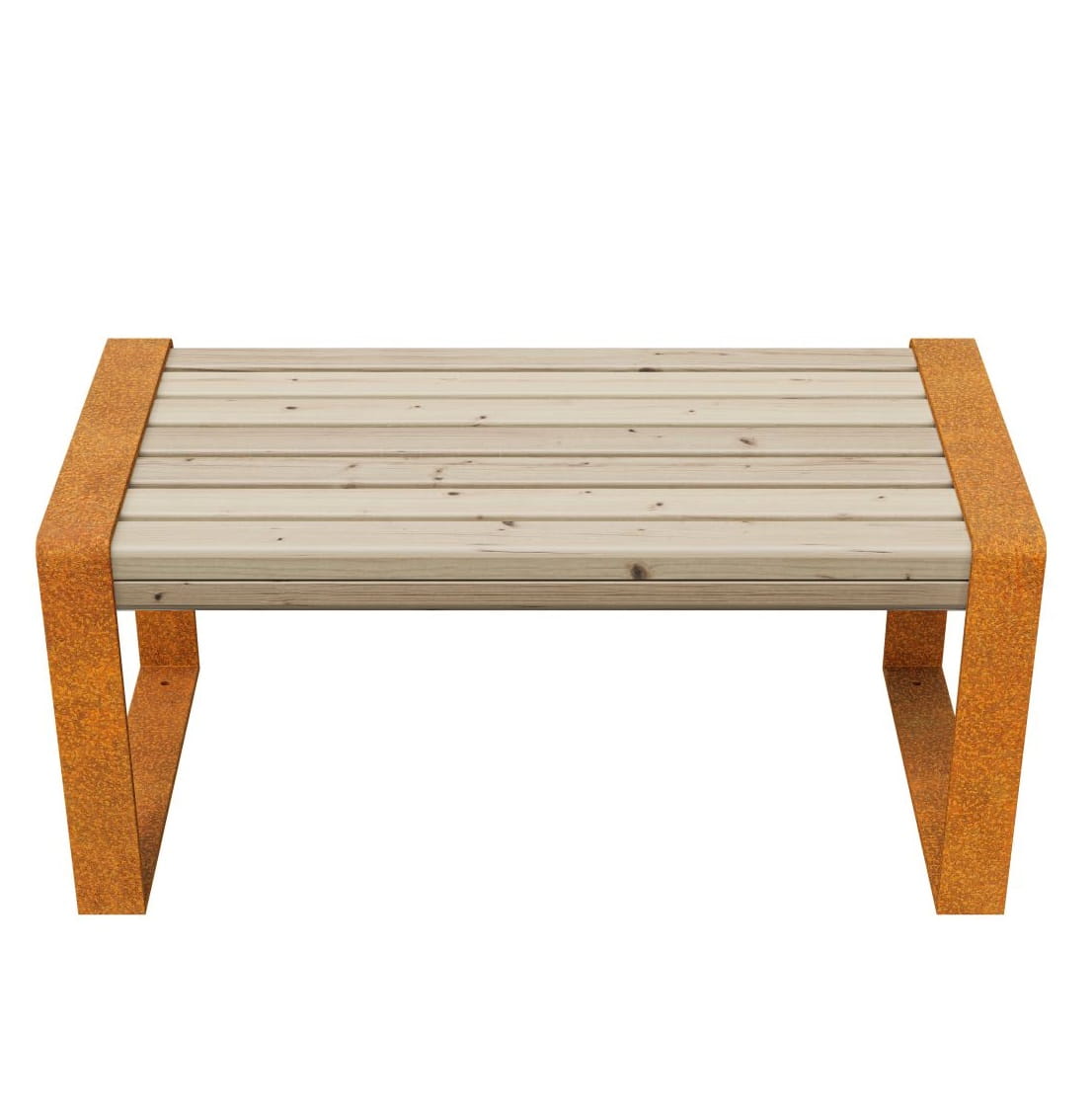 Rama, nogi siedziska wykonane są z solidnej stali corten o grubości 10 mm, co zapewnia konstrukcji niezwykłą wytrzymałość i odporność na warunki atmosferyczne. Charakterystyczna dla stali corten naturalna patyna powstająca pod wpływem działania czynników zewnętrznych nie tylko nadaje ławce unikalny, rdzawo-pomarańczowy kolor, ale także chroni metal przed korozją, gwarantując wieloletnie użytkowanie bez potrzeby konserwacji.