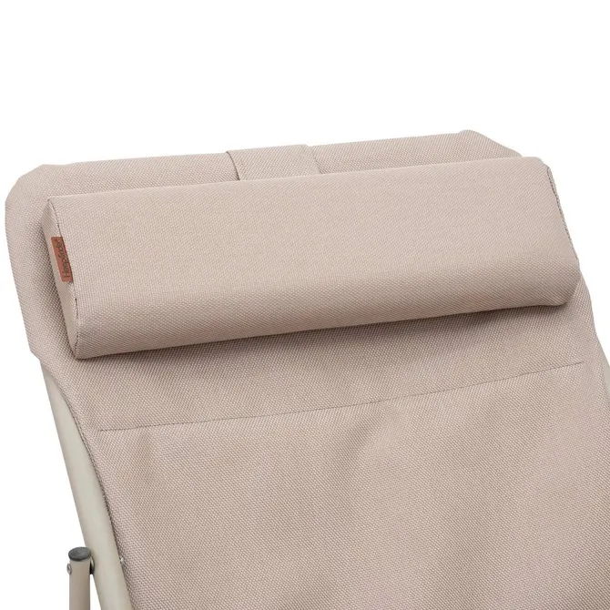 Model Mirael oferuje 4 pozycje nachylenia oparcia, co pozwala dopasować kąt do czytania, relaksu lub krótkiej drzemki. Zdejmowany zagłówek zwiększa wygodę i ułatwia czyszczenie.