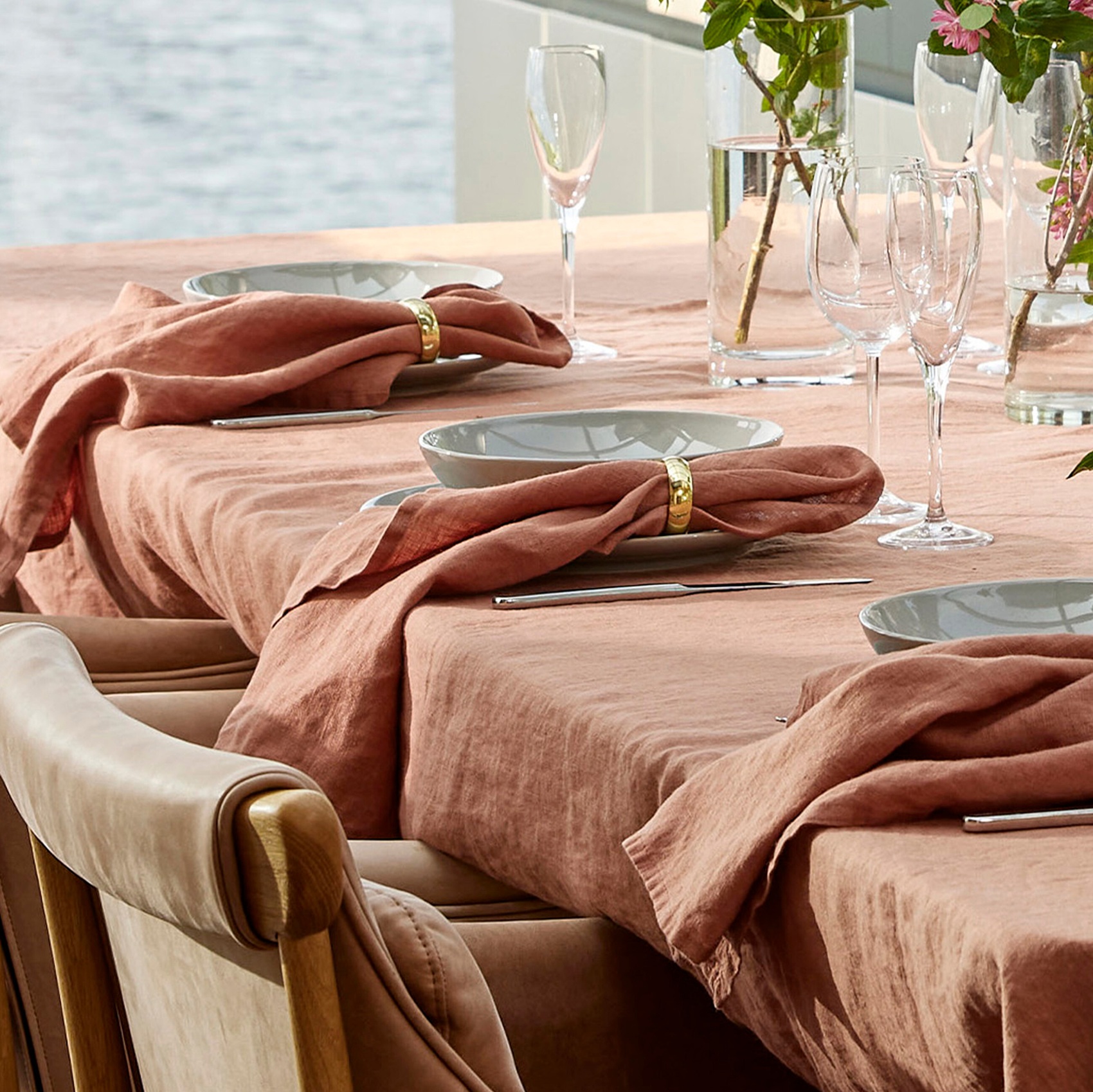 Jednokolorowy obrus lniany pozwala stworzyć spójną i elegancką aranżację bez nadmiaru wzorów.
