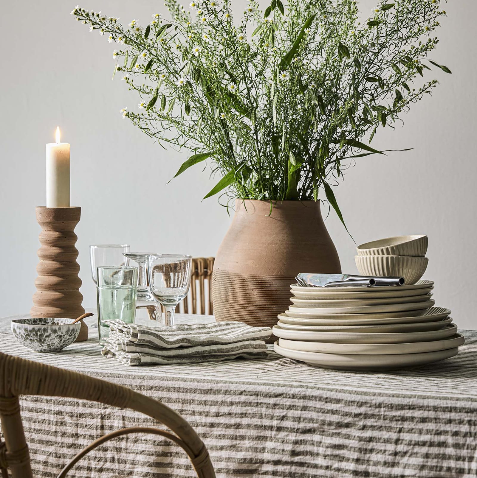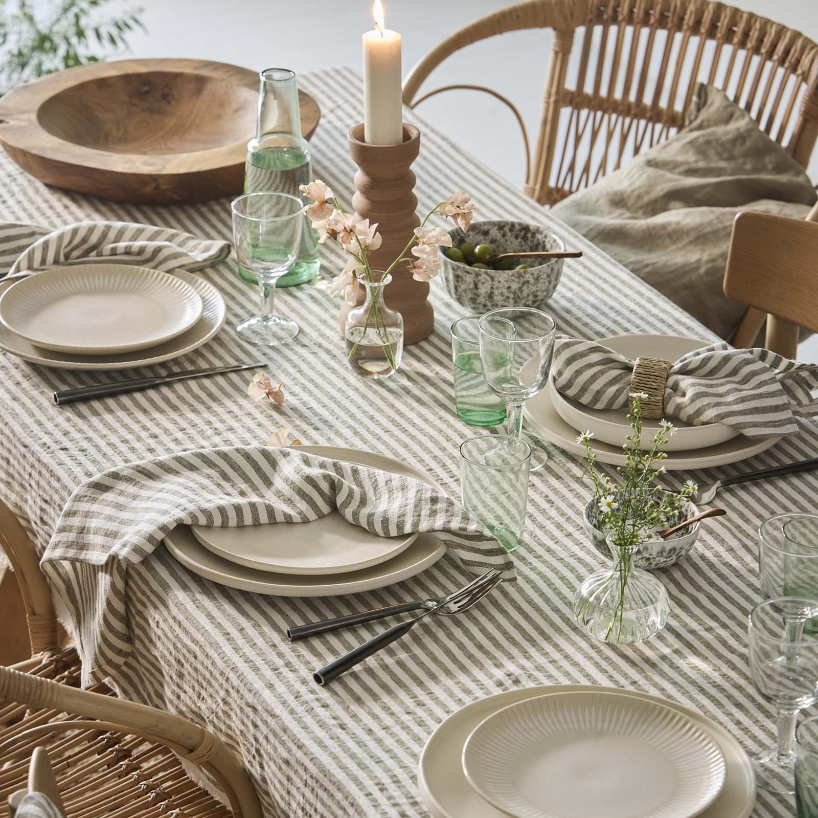 Lniany obrus w paski Leon, od Tell Me More, to kwintesencja naturalnej elegancji, która od pierwszej chwili przyciąga uwagę i odmienia charakter stołu. Wykonany ze 100% europejskiego lnu, zachwyca prostotą, autentycznością i ponadczasowym designem. To obrus, który nie tylko spełnia praktyczną rolę, ale również staje się centralnym punktem aranżacji – podkreśla wyjątkowy klimat spotkań i dodaje wnętrzu subtelnego luksusu.