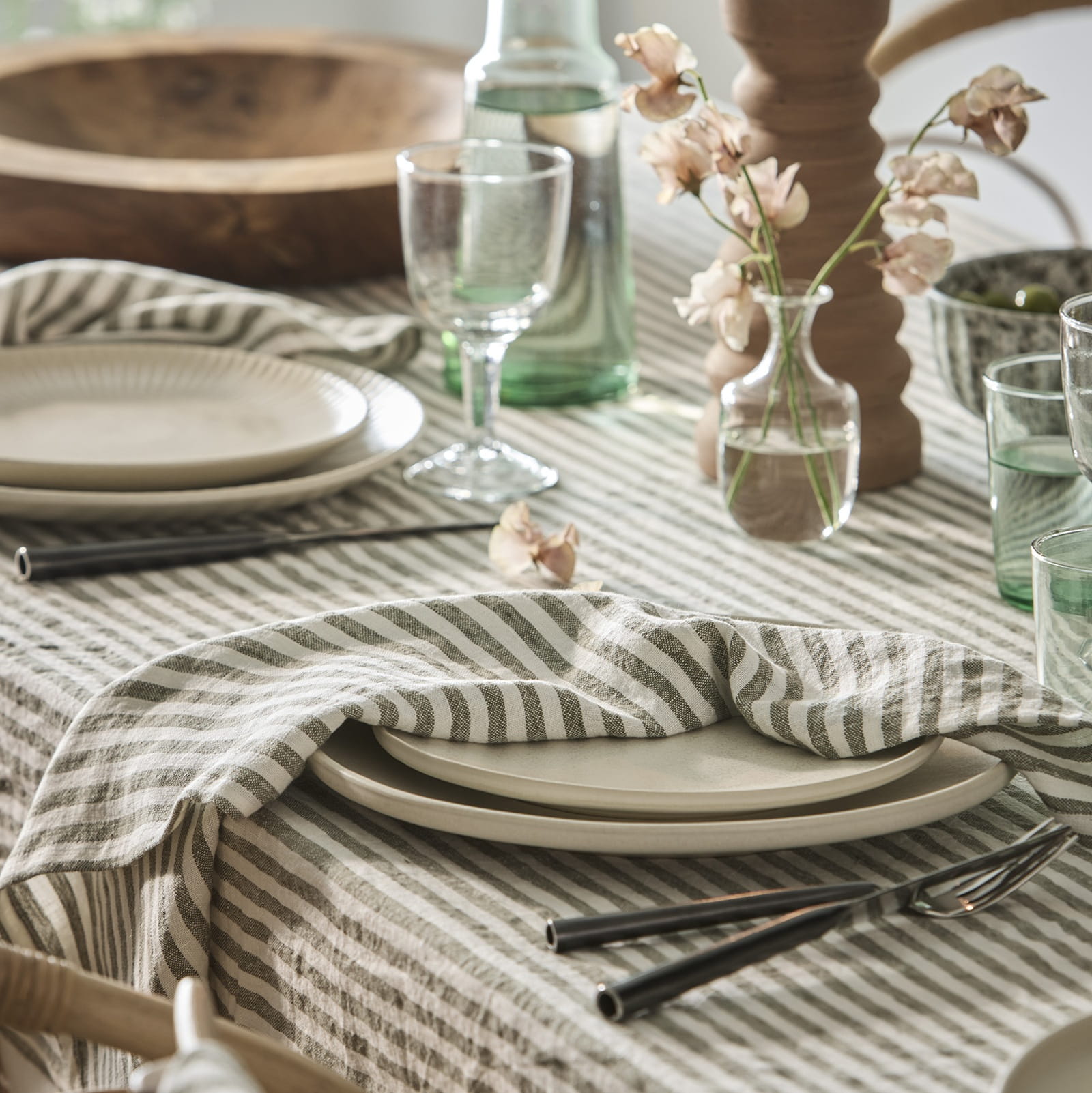 Lniany obrus w paski Leon, od Tell Me More, to kwintesencja naturalnej elegancji, która od pierwszej chwili przyciąga uwagę i odmienia charakter stołu. Wykonany ze 100% europejskiego lnu, zachwyca prostotą, autentycznością i ponadczasowym designem. To obrus, który nie tylko spełnia praktyczną rolę, ale również staje się centralnym punktem aranżacji – podkreśla wyjątkowy klimat spotkań i dodaje wnętrzu subtelnego luksusu.