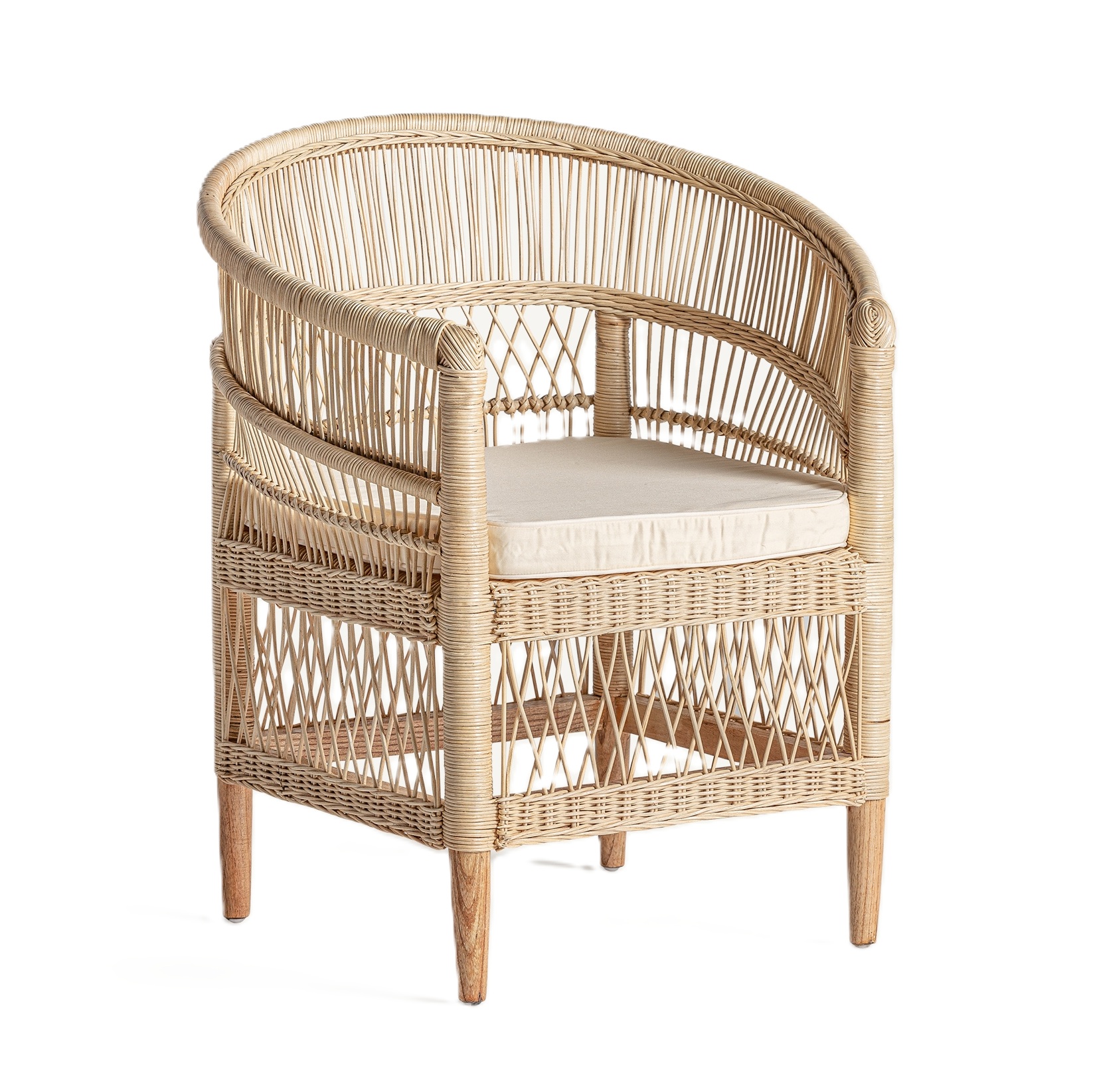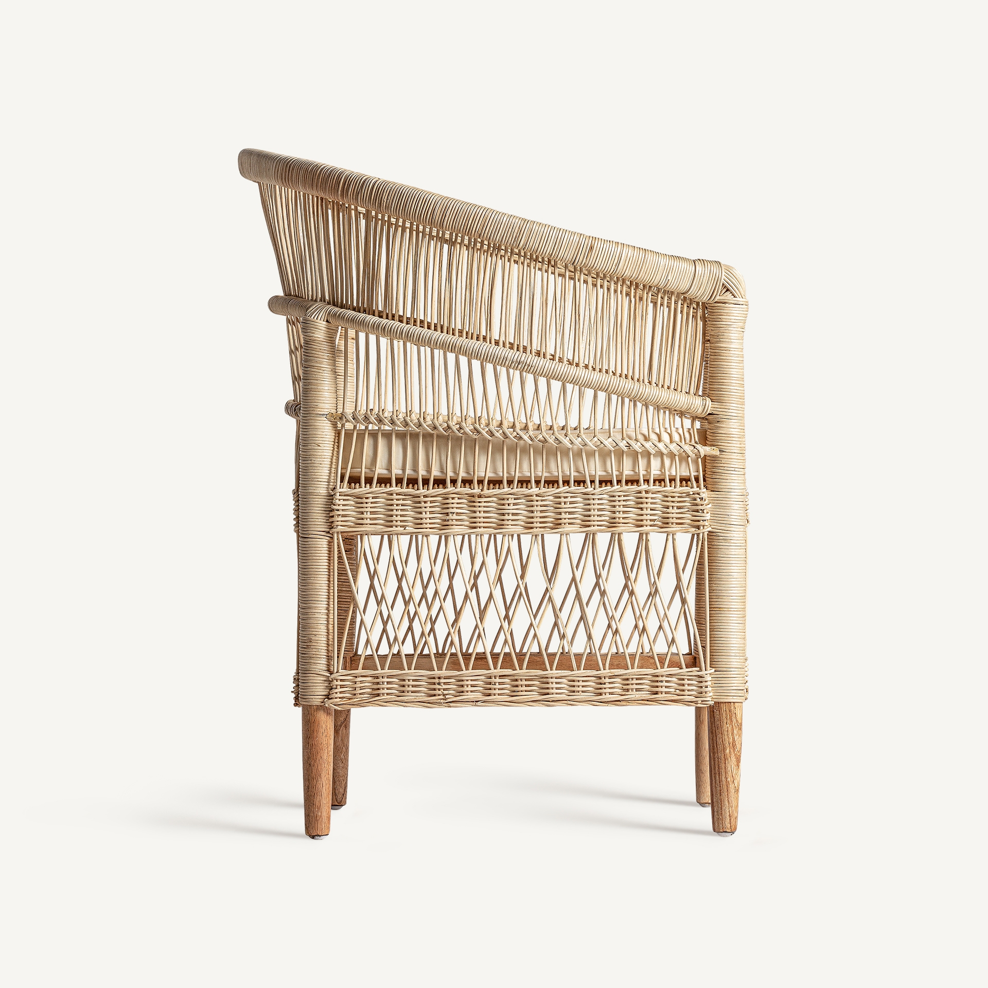 To mały fotel rattanowy z drewnem mindi i tapicerowanym siedziskiem, który łączy kompaktowy rozmiar z realną wygodą.
