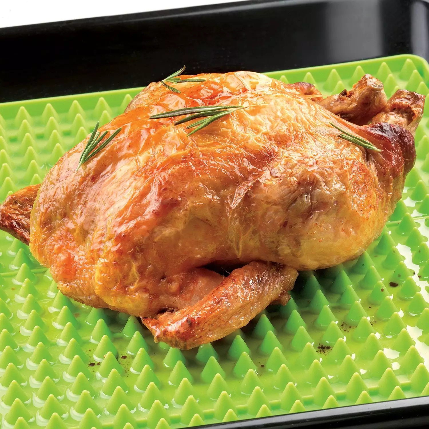 Podczas pieczenia na płaskiej powierzchni tłuszcz i wilgoć zostają pod produktem. Mata silikonowa z perforowaną strukturą pozwala je odprowadzić, dzięki czemu potrawy pieką się równomiernie z każdej strony.