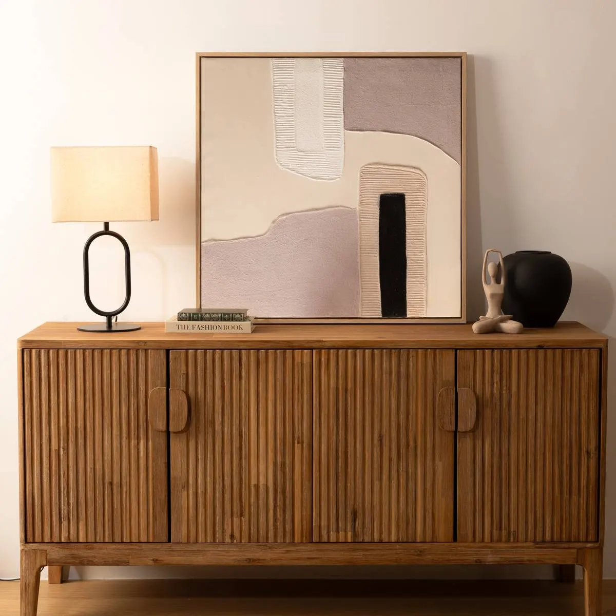 Minimalistyczny obraz 3D Laurenz został wykonany z połączenia gipsu, polistyrenu i poliestru, a tylna płyta MDF zapewnia stabilność. Drewniana rama certyfikowanego materiału z FSC eksponuje relief, a stalowe haczyki pozwalają na pewne i wygodne zawieszenie w pionie. Waga sprawia, że obraz jest łatwy w montażu, a neutralna kolorystyka doskonale współgra z drewnianymi meblami, tkaninami i metalowymi detalami.
