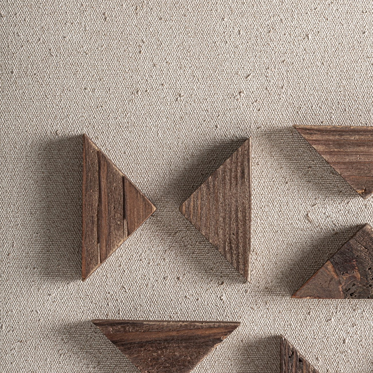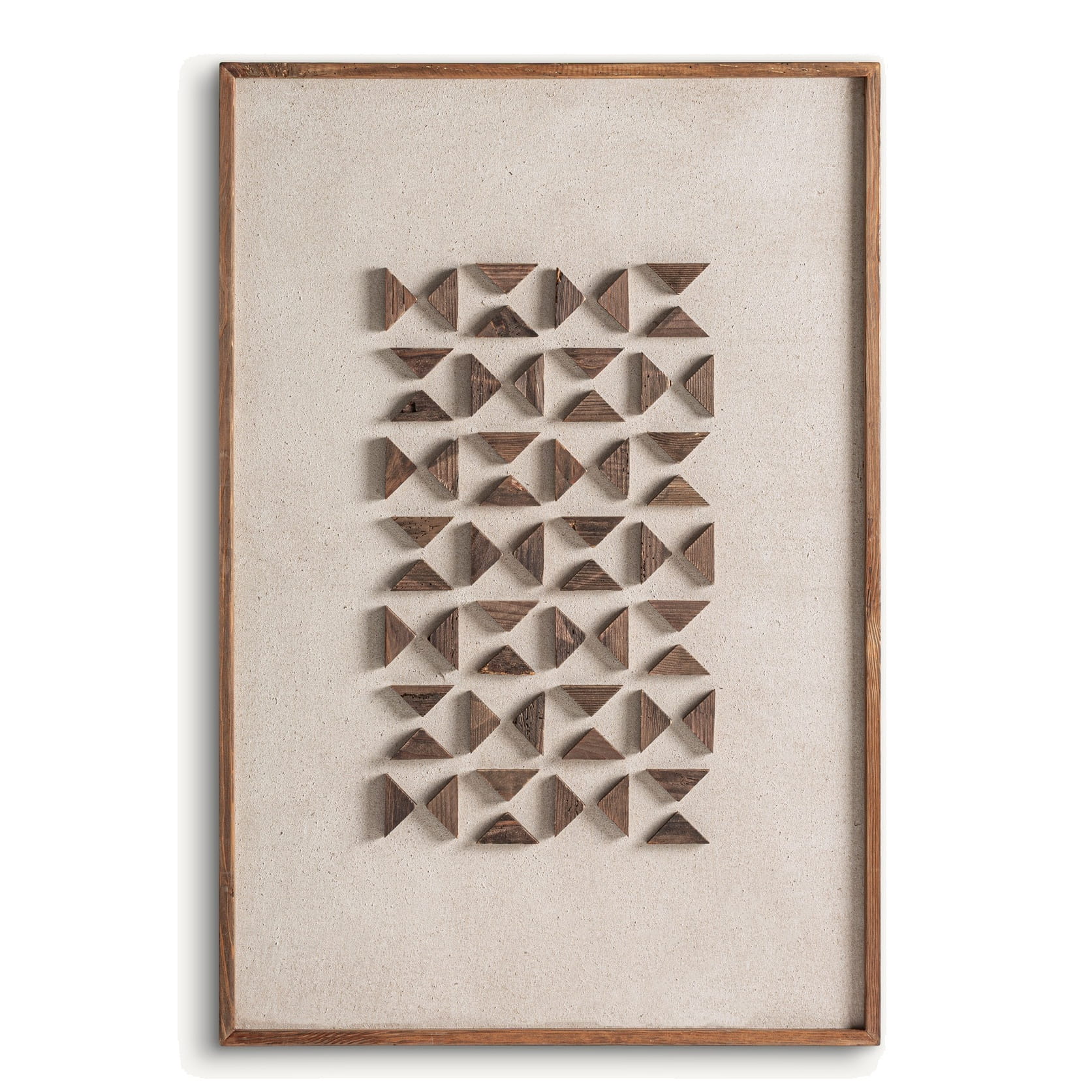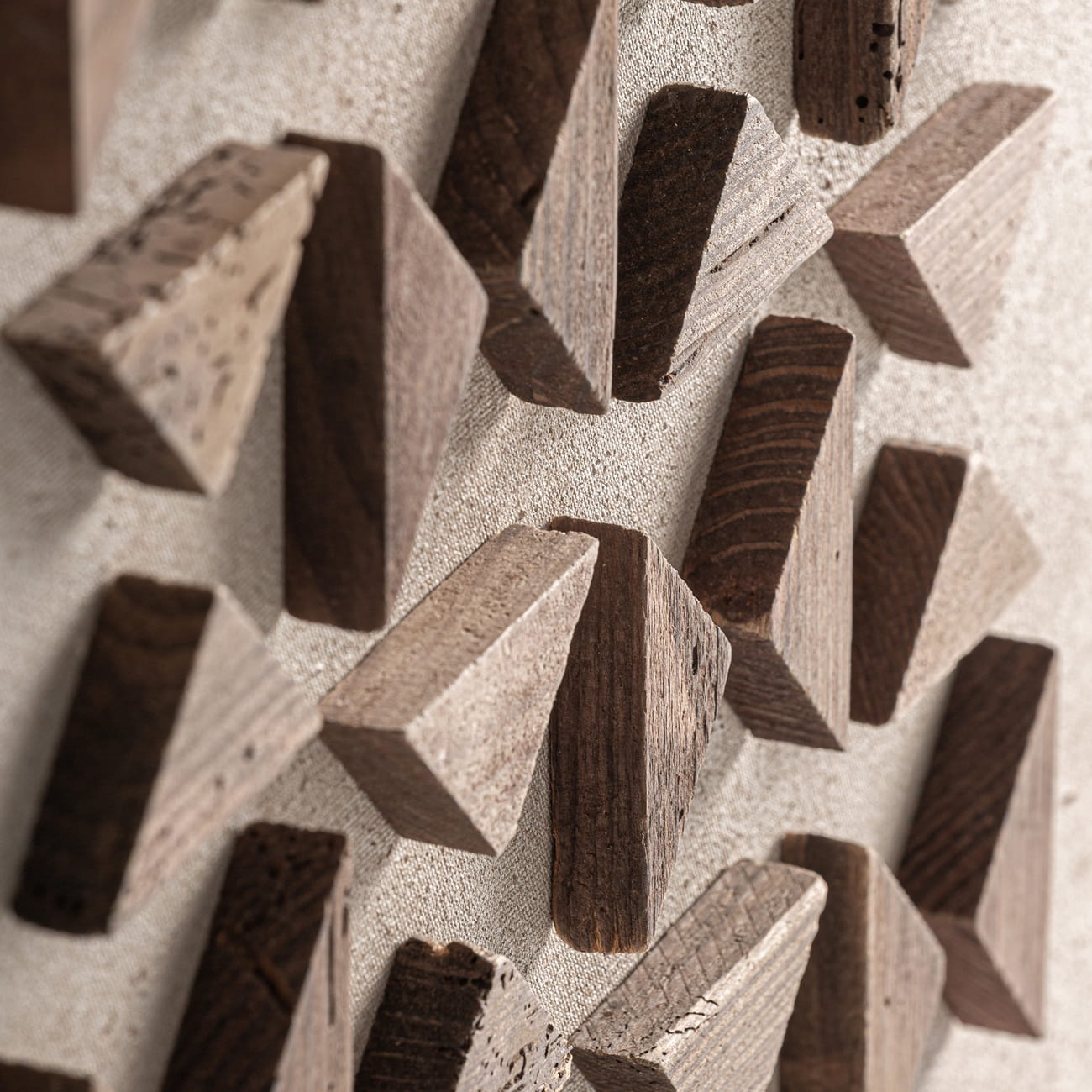 Dekor wykonany jest z drewna sosnowego z recyklingu, co nadaje każdemu egzemplarzowi indywidualny charakter. Widoczne sęki, naturalne przebarwienia i delikatne pęknięcia są efektem ręcznego wykonania i pracy z materiałem o historii, bez jego zniekształcania i upiększania. To właśnie one budują autentyczność obrazu i podkreślają jego rzemieślniczy wymiar.