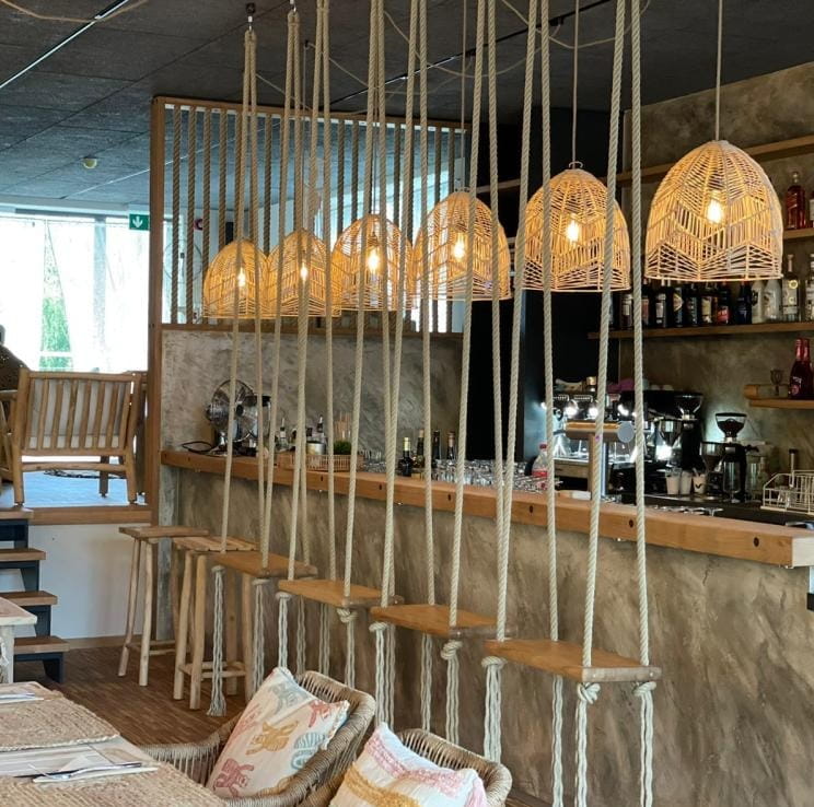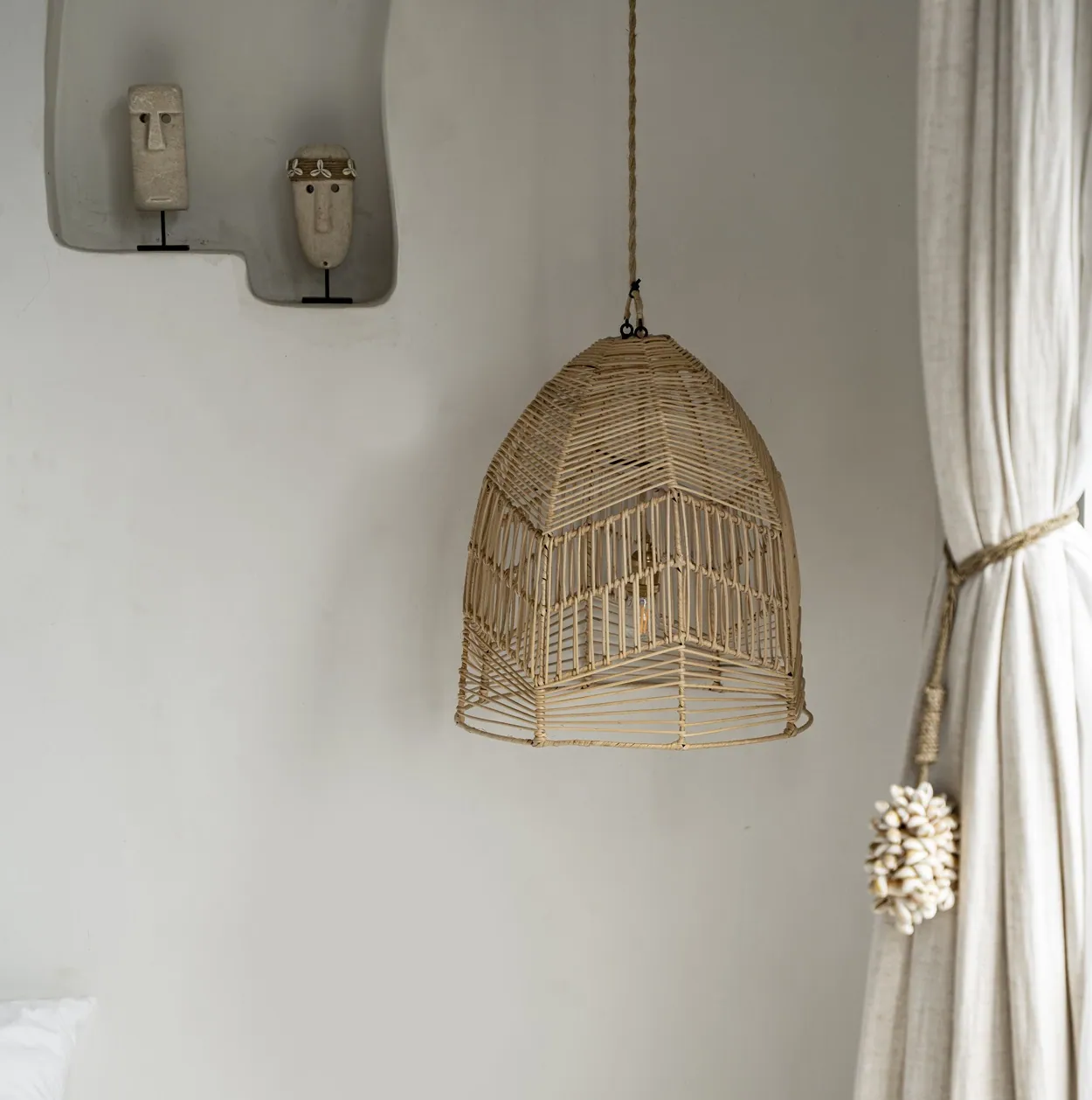 Ażurowy abażur do lamp sufitowych wiszących wykonany ręcznie z rattanu, na metalowej formie.