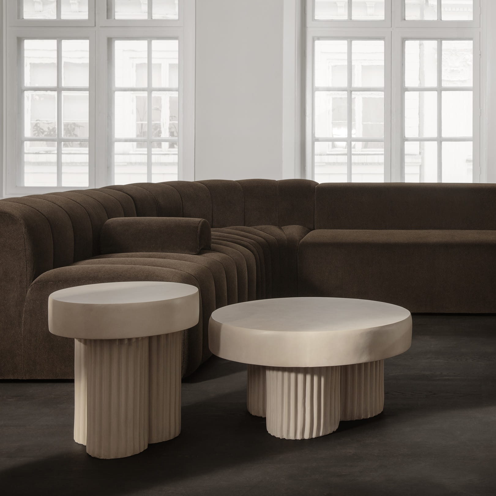 Stolik Gear Low wyróżnia gruby, okrągły blat osadzony na trzech masywnych, cylindrycznych filarach. Ryflowane nogi nadają meblowi wyraz architektonicznej rytmiki i podkreślają jego rzeźbiarski charakter. Forma jest wyrazista, ale proporcjonalna – stolik wygląda solidnie, a jednocześnie elegancko i spokojnie wpisuje się w przestrzeń salonu.
