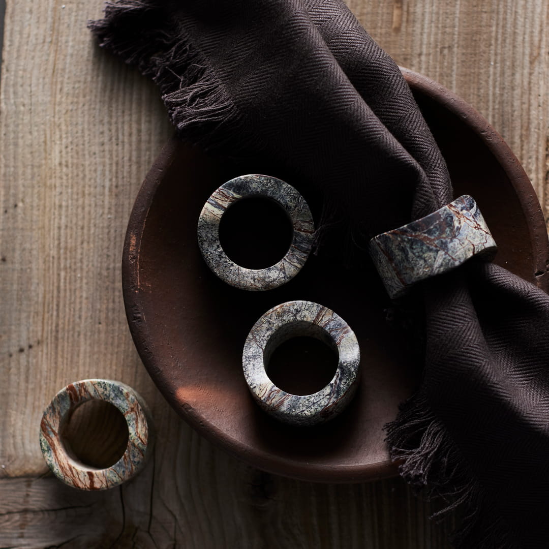 Dzięki naturalnemu marmurowi każda obrączka na serwetki Vita jest niepowtarzalna – odcienie marmuru w połączeniu z jego unikalnym użyleniem tworzą subtelne kontrasty, które pięknie komponują się z drewnem, szkłem czy metalowymi dodatkami na stole. Te małe marmurowe rzeźby z serii Vita emanują elegancją i luksusem, które doskonale wpisują się w styl nowoczesny, klasyczny, minimalistyczny czy boho.
