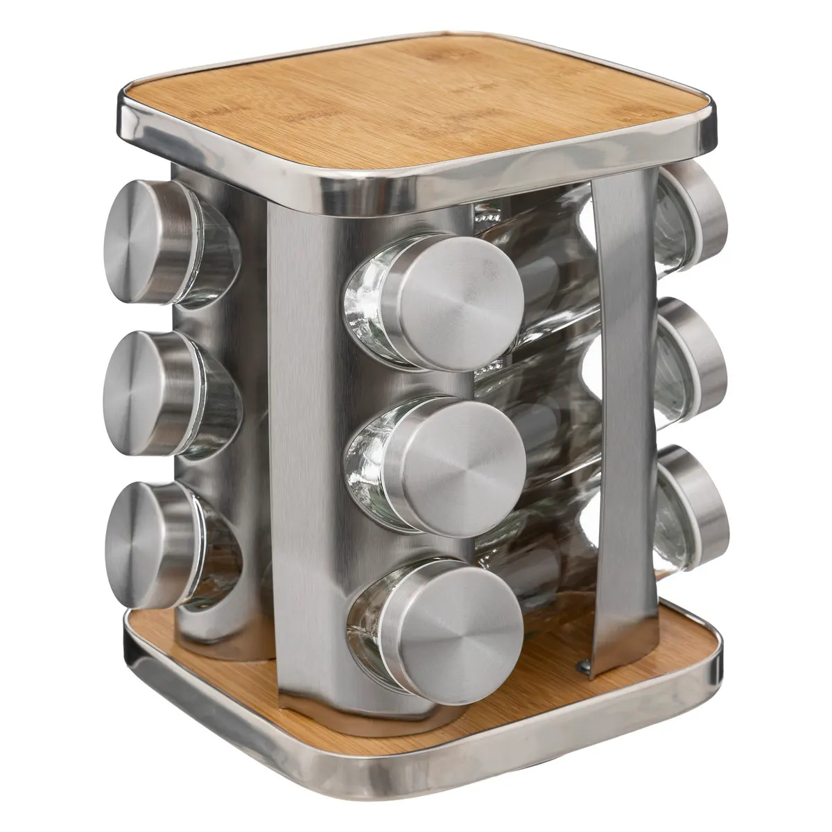 Nowoczesny design stojaka na przyprawy harmonijnie łączy ciepło naturalnego bambusa z eleganckim wyglądem stali nierdzewnej, tworząc efektowny element dekoracyjny każdej kuchni. Ten obrotowy stojak na przyprawy nie tylko ułatwia gotowanie, ale także podkreśla styl i dbałość o szczegóły w aranżacji wnętrza. To kuchenny dodatek, który łączy praktyczność z elegancją, idealny zarówno do codziennego użytku, jak i na prezent dla miłośnika gotowania.