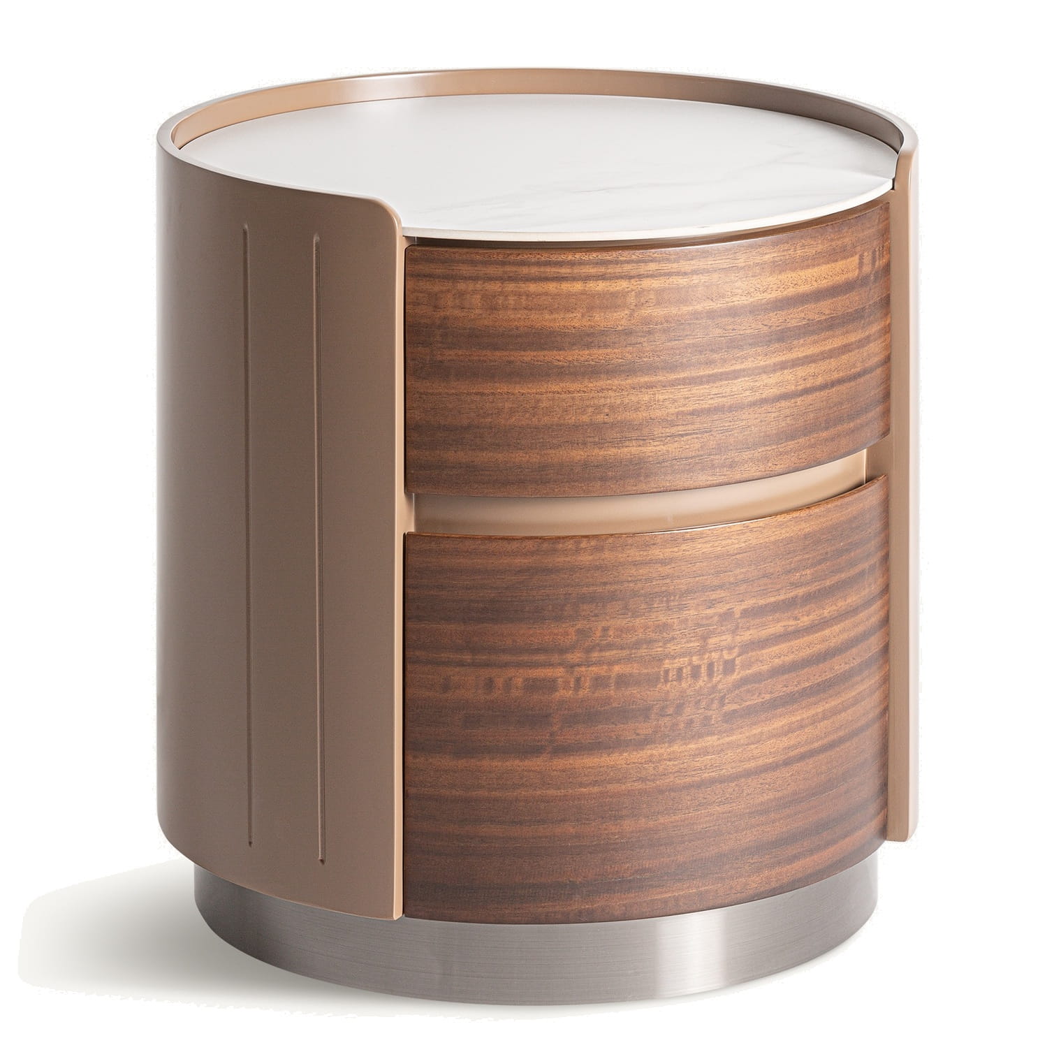 Okrągła szafka nocna z szufladami do sypialni z jasnobrązowej sklejki, forniru eukaliptusowego i spieku kamiennego Giswil marki VICAL to kompaktowy mebel zaprojektowany do ustawienia bezpośrednio przy łóżku, tam gdzie liczy się zarówno funkcja, jak i wyważona estetyka. Połączenie brązowej sklejki o matowym wykończeniu, jasnobrązowego, szczotkowanego forniru eukaliptusowego oraz blatu z białego spieku kamiennego tworzy miękką wizualnie, a jednocześnie wyrazistą formę. Okrągły kształt wprowadza do sypialni łagodność i naturalny rytm, który dobrze współgra z tapicerowanymi łóżkami i spokojnymi aranżacjami wnętrz.