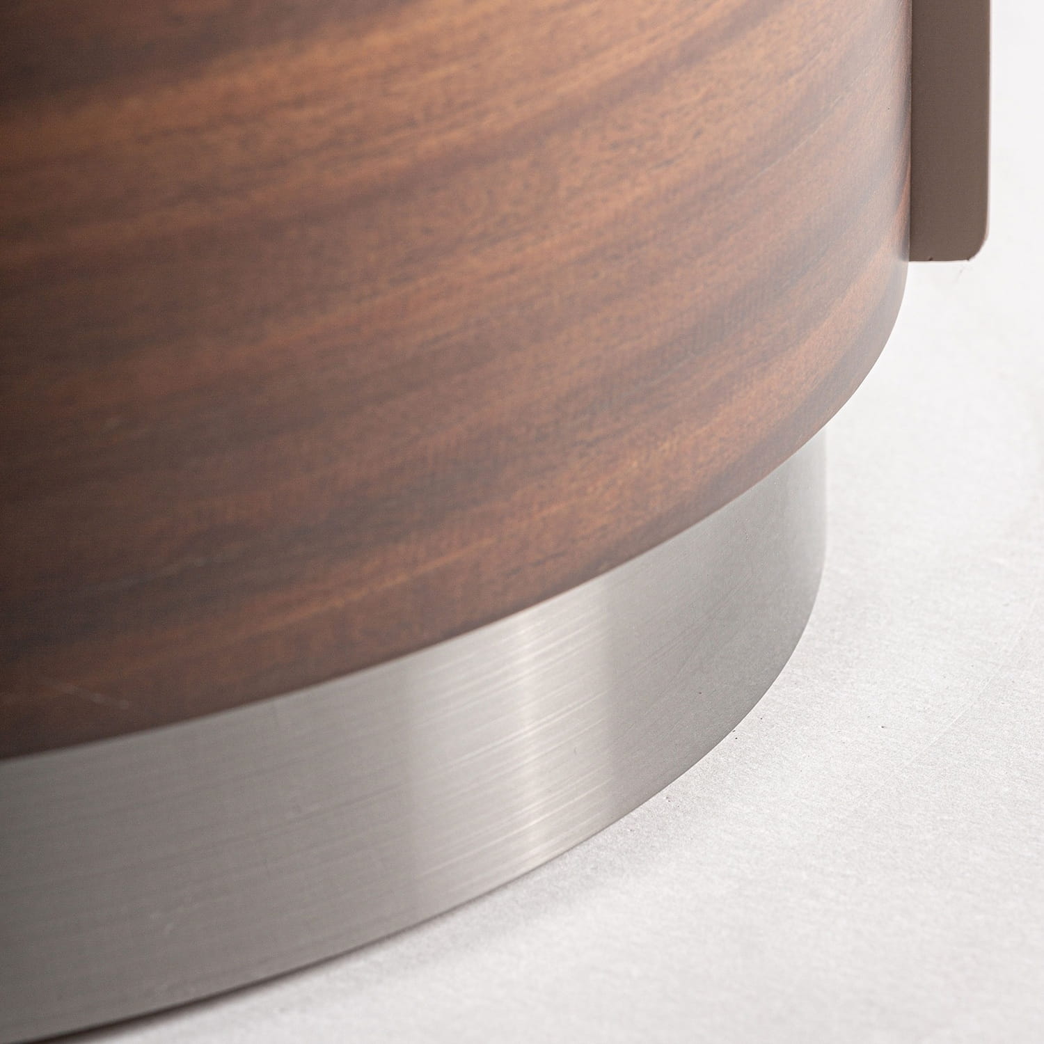 Korpus z matowej jasnobrązowej sklejki w połączeniu z fornirem eukaliptusowym wprowadza naturalne ciepło i delikatną strukturę drewna. Blat z białego spieku kamiennego o matowym wykończeniu zapewnia trwałą i praktyczną powierzchnię na lampę nocną, książkę lub dekoracje. Subtelne różnice w rysunku drewna podkreślają indywidualny charakter każdego egzemplarza.