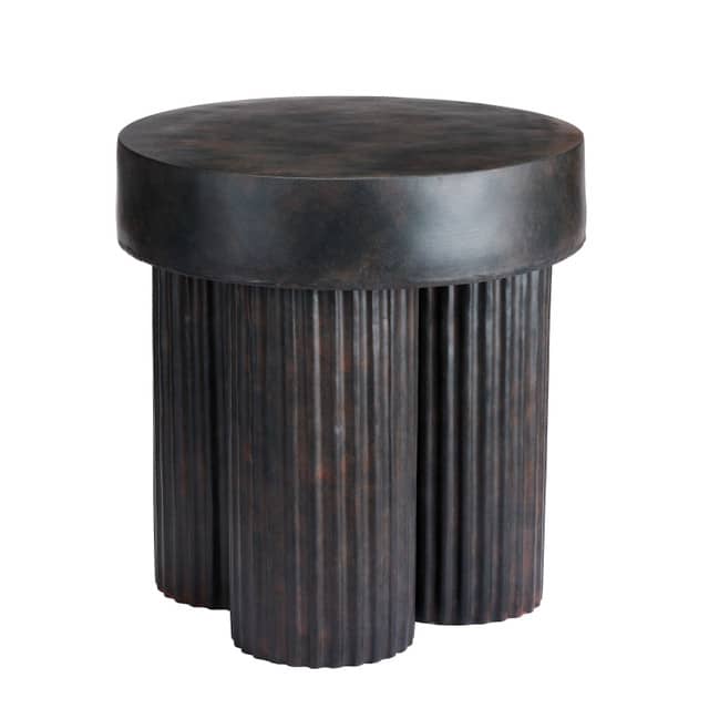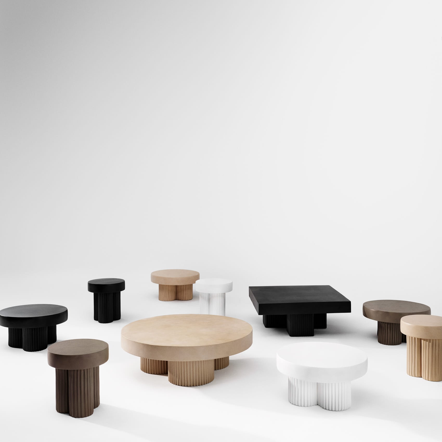 Stolik Gear High Tall wyróżnia gruby, okrągły blat osadzony na trzech masywnych, cylindrycznych filarach z wyraźnym ryflowaniem. Ta forma nawiązuje do brutalistycznej architektury XX wieku, skupionej na bryle, rytmie i materiale. Betonowa konstrukcja jest wizualnie mocna, ale proporcje sprawiają, że stolik pozostaje elegancki i wyważony.