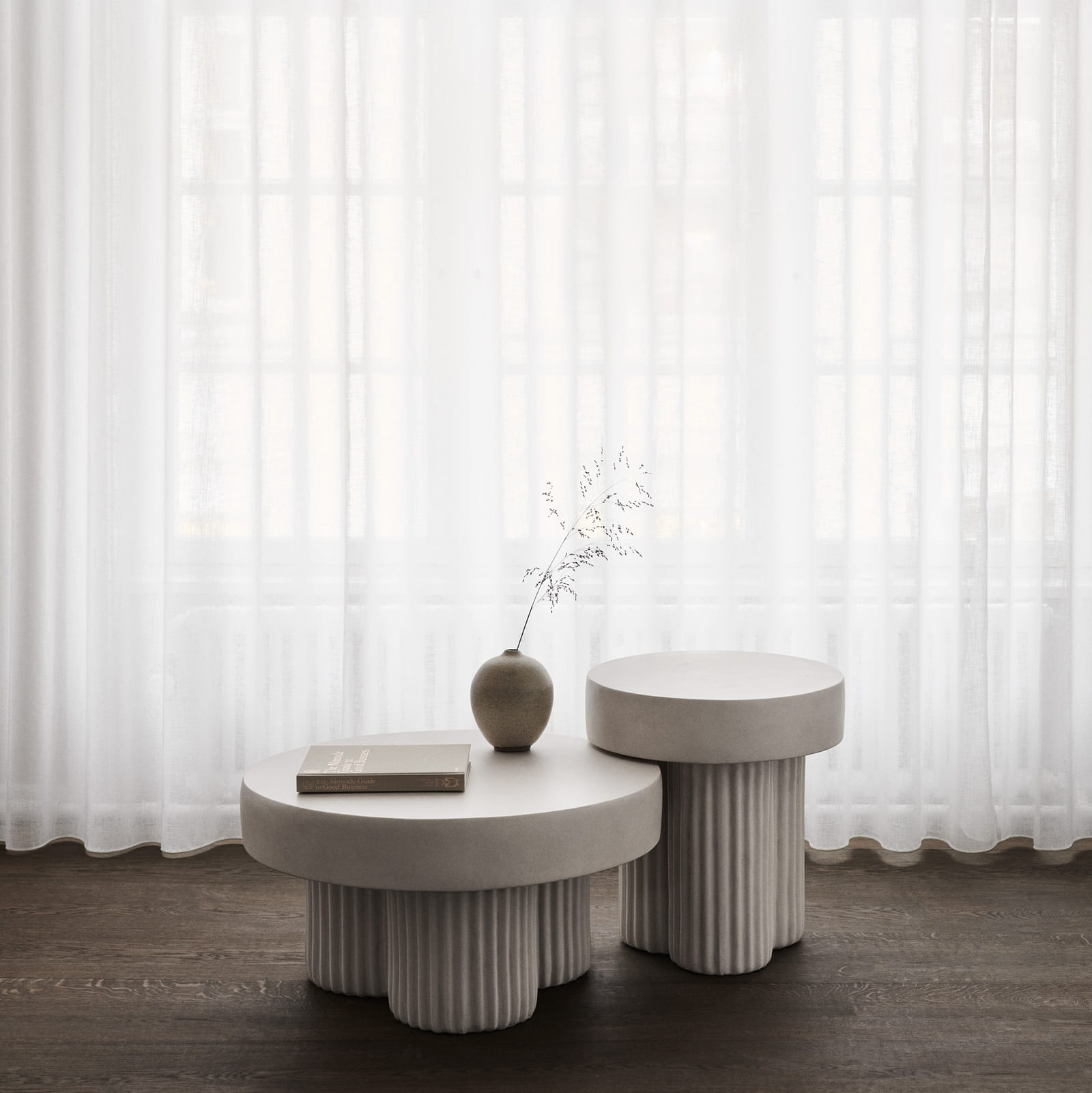Stolik Gear High Tall wyróżnia gruby, okrągły blat osadzony na trzech masywnych, cylindrycznych filarach z wyraźnym ryflowaniem. Ta forma nawiązuje do brutalistycznej architektury XX wieku, skupionej na bryle, rytmie i materiale. Betonowa konstrukcja jest wizualnie mocna, ale proporcje sprawiają, że stolik pozostaje elegancki i wyważony.