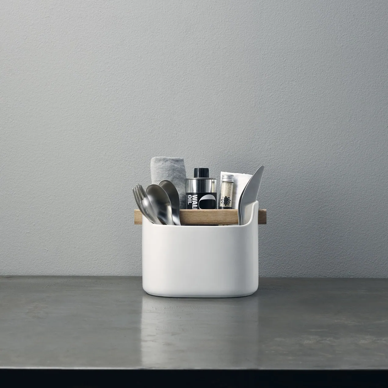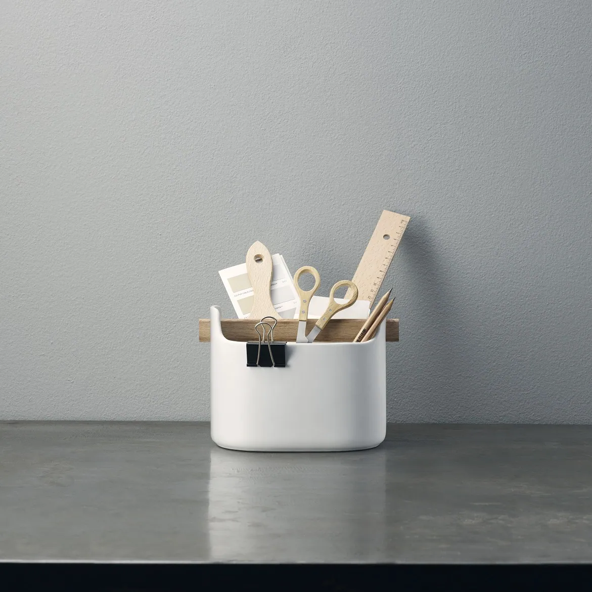 Toolbox to estetyczny pojemnik ceramiczny, posiada drewnianą rączkę, która dodatkowo pełni funkcję przegrody, dzięki czemu można łatwo zorganizować różne przedmioty, takie jak akcesoria do zmywania, szczotki, ściereczki, nożyczki czy przybory kuchenne.