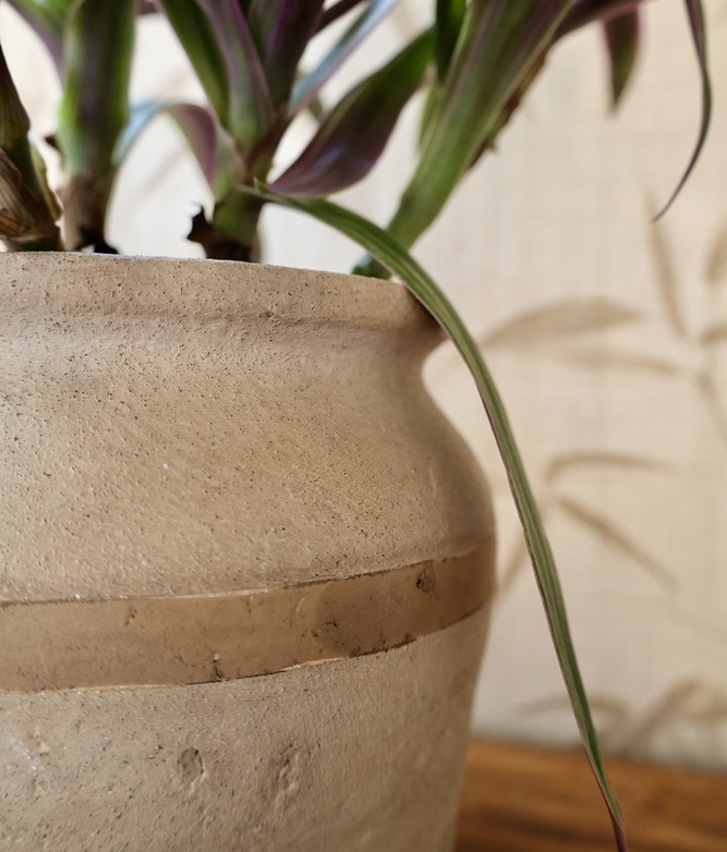 Matowa, surowa ceramika podkreśla naturalny charakter materiału, a poziomy pas w kontrastowym odcieniu buduje subtelny akcent kolorystyczny i porządkuje proporcje bryły.