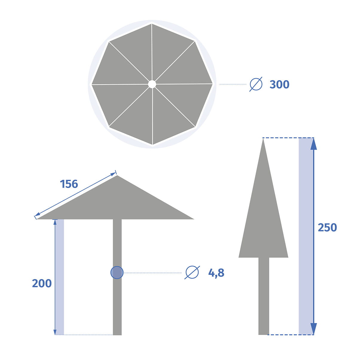 - Wymiary: średnica 3 m, wysokość całkowita 2,5 m. Średnica masztu 4,8 cm