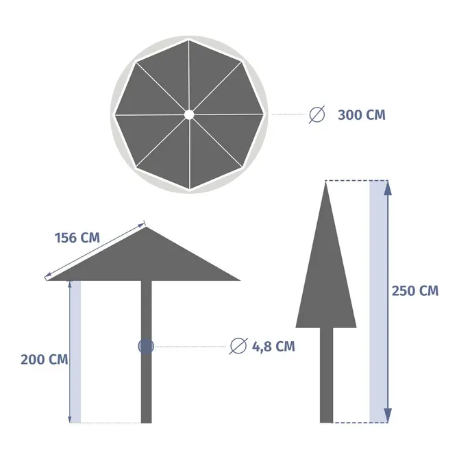 - Wymiary: średnica 3 m, wysokość całkowita 2,5 m. Średnica masztu 4,8 cm