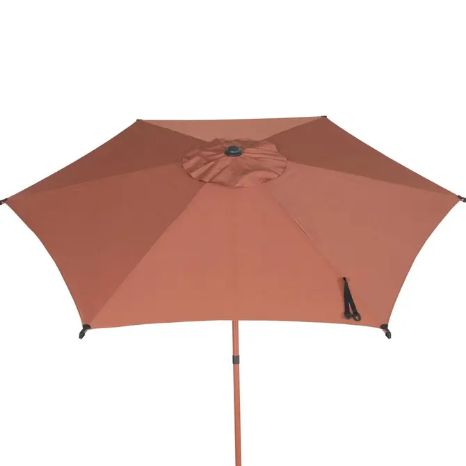 Parasol ogrodowy Soya posiada specjalny komin umożliwiający cyrkulację powietrza. Dzięki temu, pod parasolem nie gromadzi się ciepło, co zwiększa komfort podczas gorących dni. Materiał parasola jest solidnie przykręcony do żeberek, co zapewnia mu stabilność i trwałość.