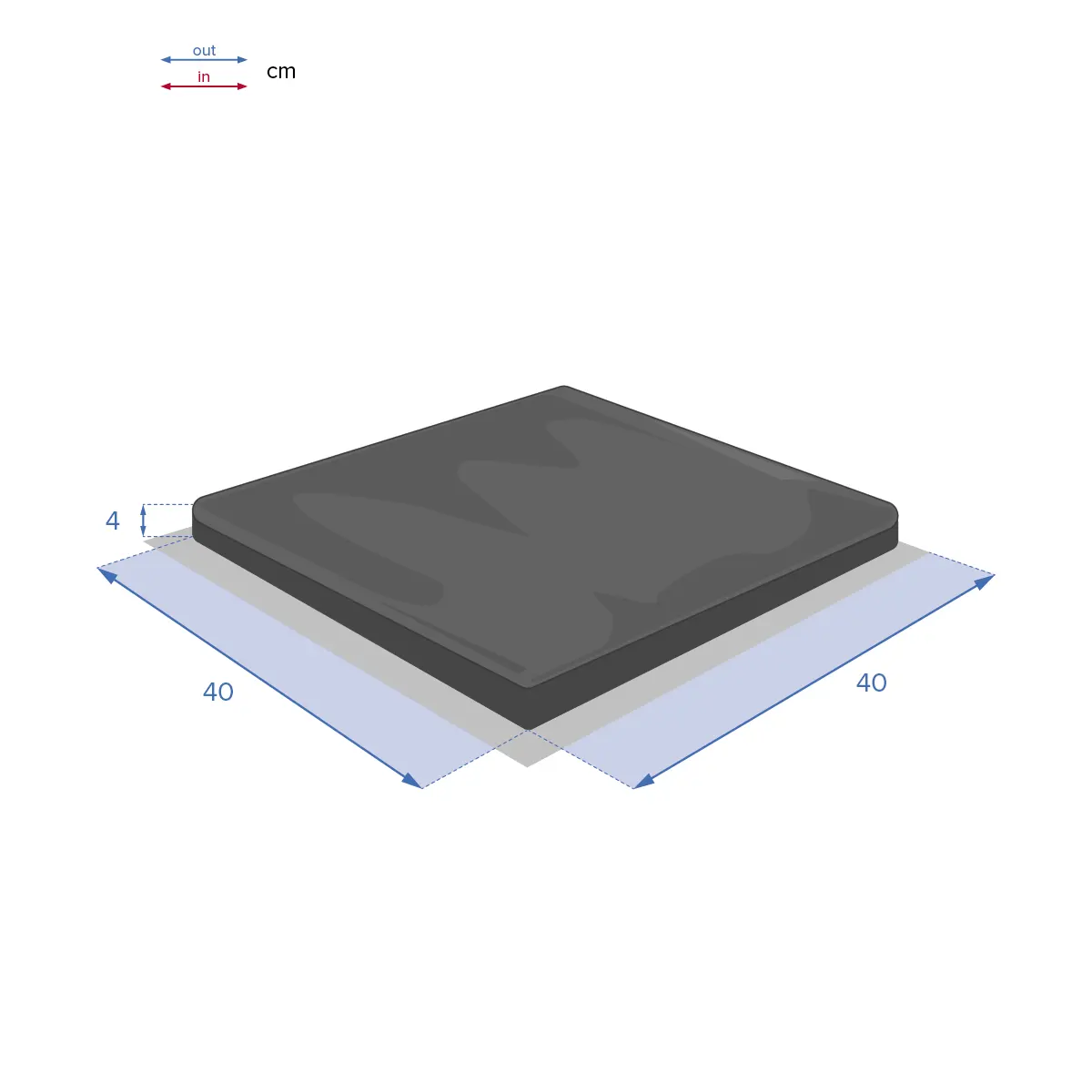 - Wymiary: 40 x 40 cm, wysokość 4 cm. Długość paska 32 cm, długość rzepa 18 cm